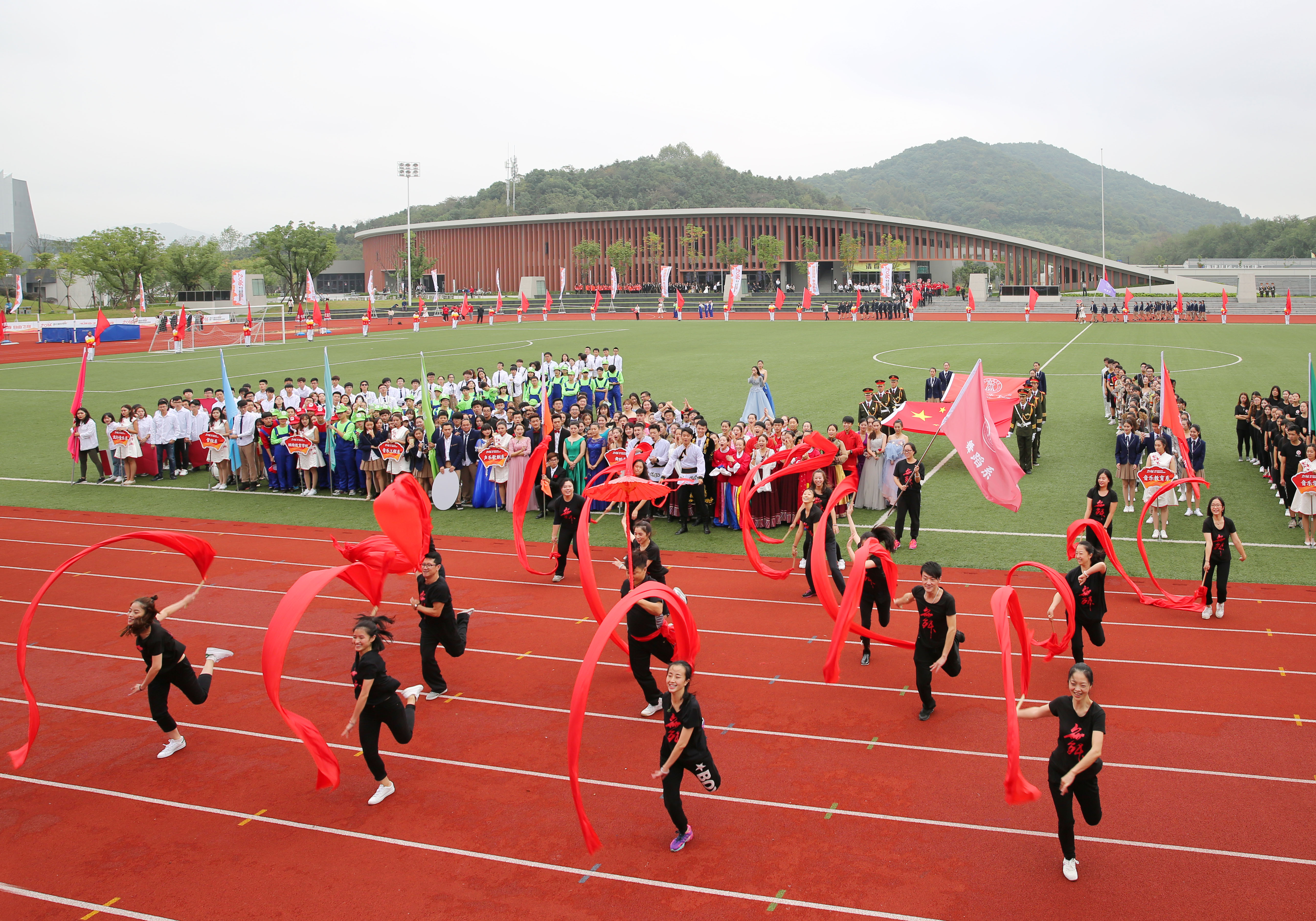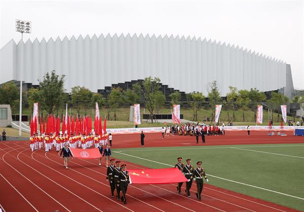 运动场上,横幅悬挂、彩旗招展,梦想与青春共飞扬。伴随着激扬雄壮的进行曲,仪仗队护卫着鲜红的五星红旗正步走过主席台前方,紧随其后的是校旗、红旗方阵,旗手们英姿飒爽地步入会场。11个系、继续教育学院和研究生组成的学生方阵依次入场,他们为运动会献上了精心编排的方阵团队表演,展现出了专业特点和良好的学生风貌。最后,16个分工会教师组成的方阵英姿飒爽地入场,用积极向上的精神风貌展现教师们的风采。
