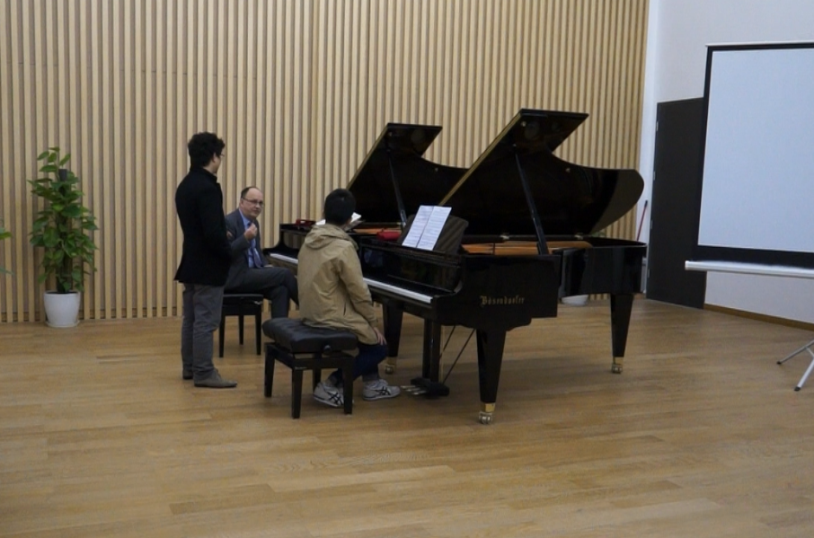 格兰姆教授分别对我院钢琴系四位学生进行曲目上的讲解与分析,并给予一定的示范。格兰姆教授重视谱面上所写的内容,包括速度、强弱、表情术语以及演奏标记等,同时他也重视乐句的气息和声部层次,要求演奏时尽可能地符合作曲家的想法。除此,他还告诉学生可从调性去把控情感,可通过对声音的想象演绎出不同乐器的音色。