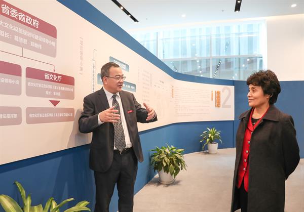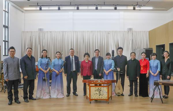 林蕙青一行在学院校史馆听取了党委书记褚子育对学院筹建思路与路径、基本概况和内涵建设情况的详细汇报,参观了音乐厅、标准化考场等教学场馆和设施设备,并饶有兴致地观摩了师生教学实践排练。林蕙青对学院建设与发展取得的成绩给予了高度评价,并希望学院进一步加强内涵建设,把学院尽快办好、办强。
