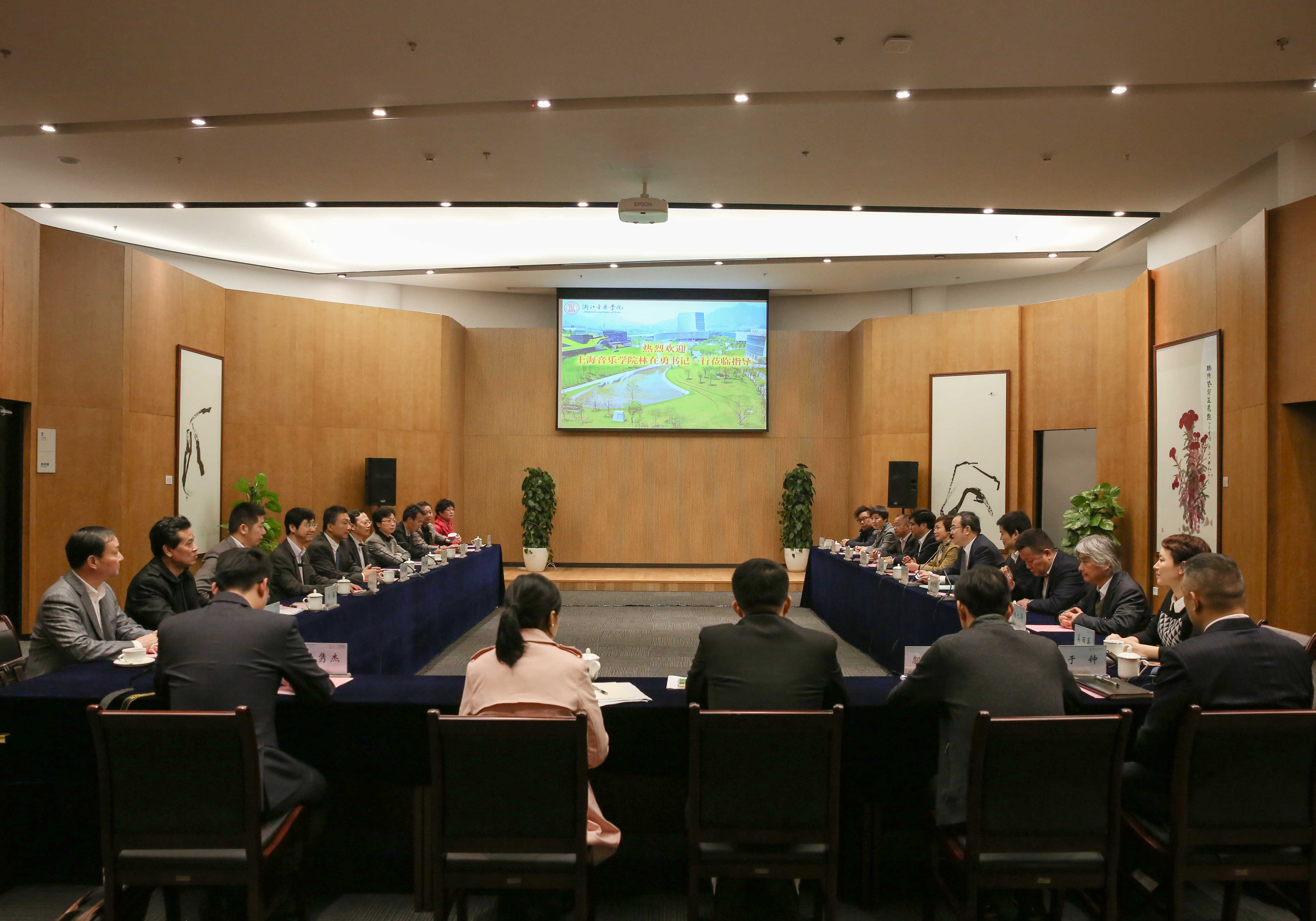11月4日,上海音乐学院党委书记、院长林在勇带领党委副书记、副院长王瑞,副院长杨燕迪,总会计师张佳春及相关部门负责人一行11人专程来到我院进行考察指导,并与我院签署合作办学备忘录。学院党委书记褚子育,党委副书记、副院长张建国,党委副书记贾秀英,副院长张鸿雁,纪委书记方培新,副院长杨九华及相关职能部门负责人热情接待及进行了座谈交流。