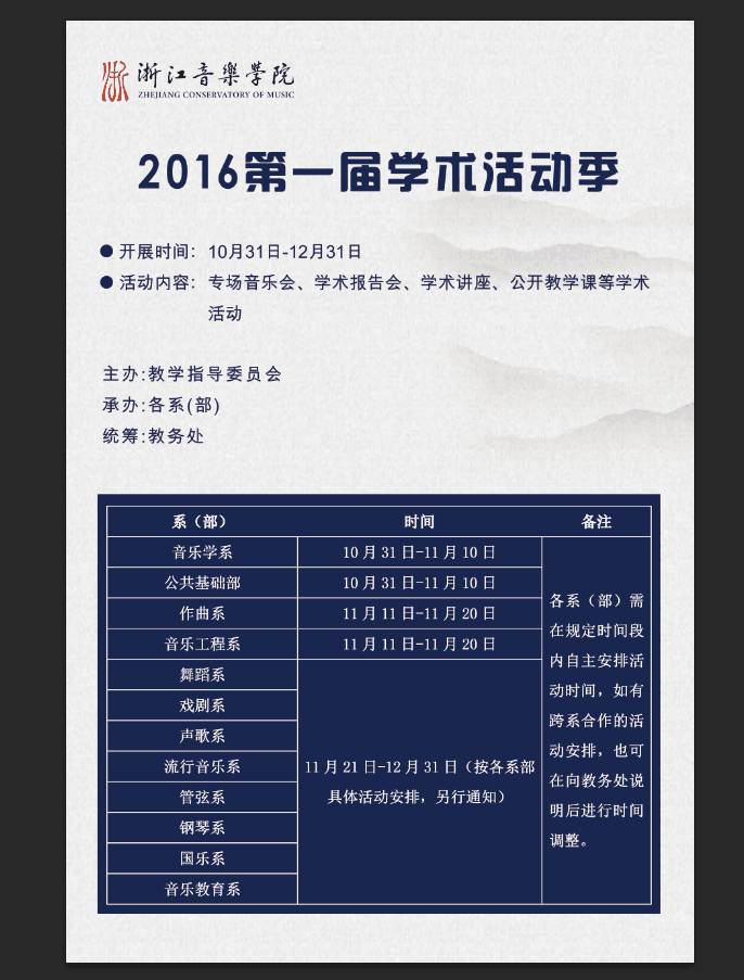 自学术活动季启动以来,学院各系部陆续推出各类型学术交流活动,浓郁的学术氛围为冬日的浙音校园增添了阵阵动情的暖意。学术活动季既是全体教师展现高素质专业水平的实践舞台,也是蕴含着丰富精彩内容,寓学术性、教育性与参与性于一体的艺术盛宴 。今后,学院将每年举办。