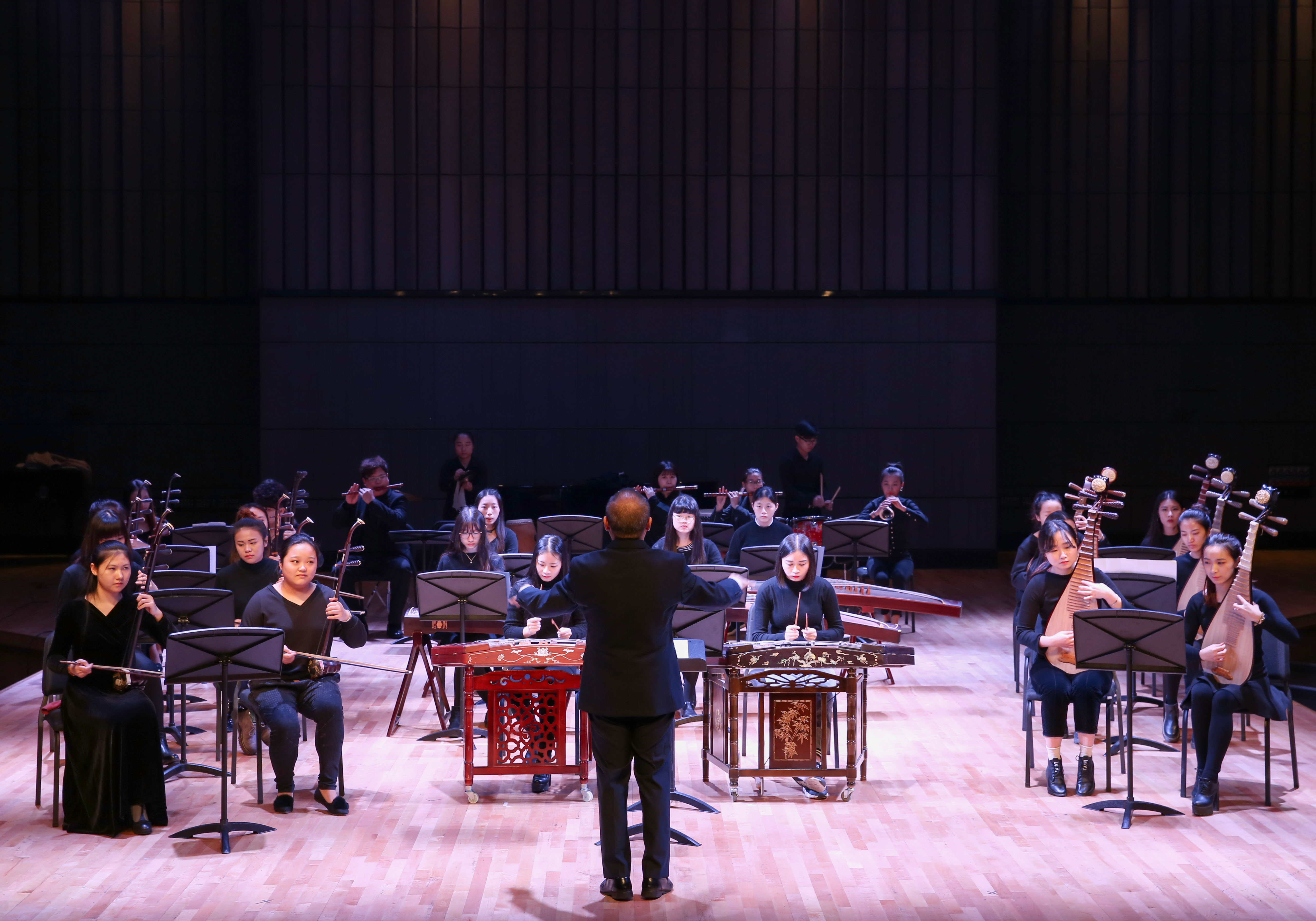 二胡、扬琴、琵琶、古筝、笛子等乐器齐声合奏,一曲气势磅礴、金振玉声的民乐合奏《龙腾虎跃》拉开了学生实习乐团汇报演出的序幕。由周杰指挥,学生实习乐团民乐队演奏的又一曲《苏堤漫步》让观众有一种心生愉悦通透之感,仿若置身于一派旖旎宜人的西湖美景之中。两首曲目一动一静,相得益彰。“吐鲁番的姑娘,一朵玫瑰花”,由教师陈利敏指导,胡慧晨子、叶雨婷等演唱的女生小组唱《吐鲁番的姑娘》以亮眼的服饰、真诚的演绎,让观众过目不忘。尾声处,姑娘们抛出的是玫瑰花,留给观众的是无限的遐想。由教师陈声钢指导,张璐茜演奏的钢琴独奏《热情的快板》用纯熟的技巧展示着作品标题“热情”的寓意所在。而由教师陈琼指导、张一驰演奏的钢琴独奏《皮黄》,则以一种直击人心的力量,游刃有余地展现出京剧音乐元素和现代专业作曲技法结合的魅力。古琴独奏《酒狂》另辟蹊径,在教师徐君跃指导下,陈思怡将古琴狂放不羁的一面展现于舞台上,平和之下暗流涌动,将狂徒醉态展现得淋漓尽致。男声独唱《我的太阳》由教师张羡声指导,在谢磊磊的演唱下,这首耳熟能详的经典之作,散发出饱满而明亮的舞台魅力,令人乐享其中。
