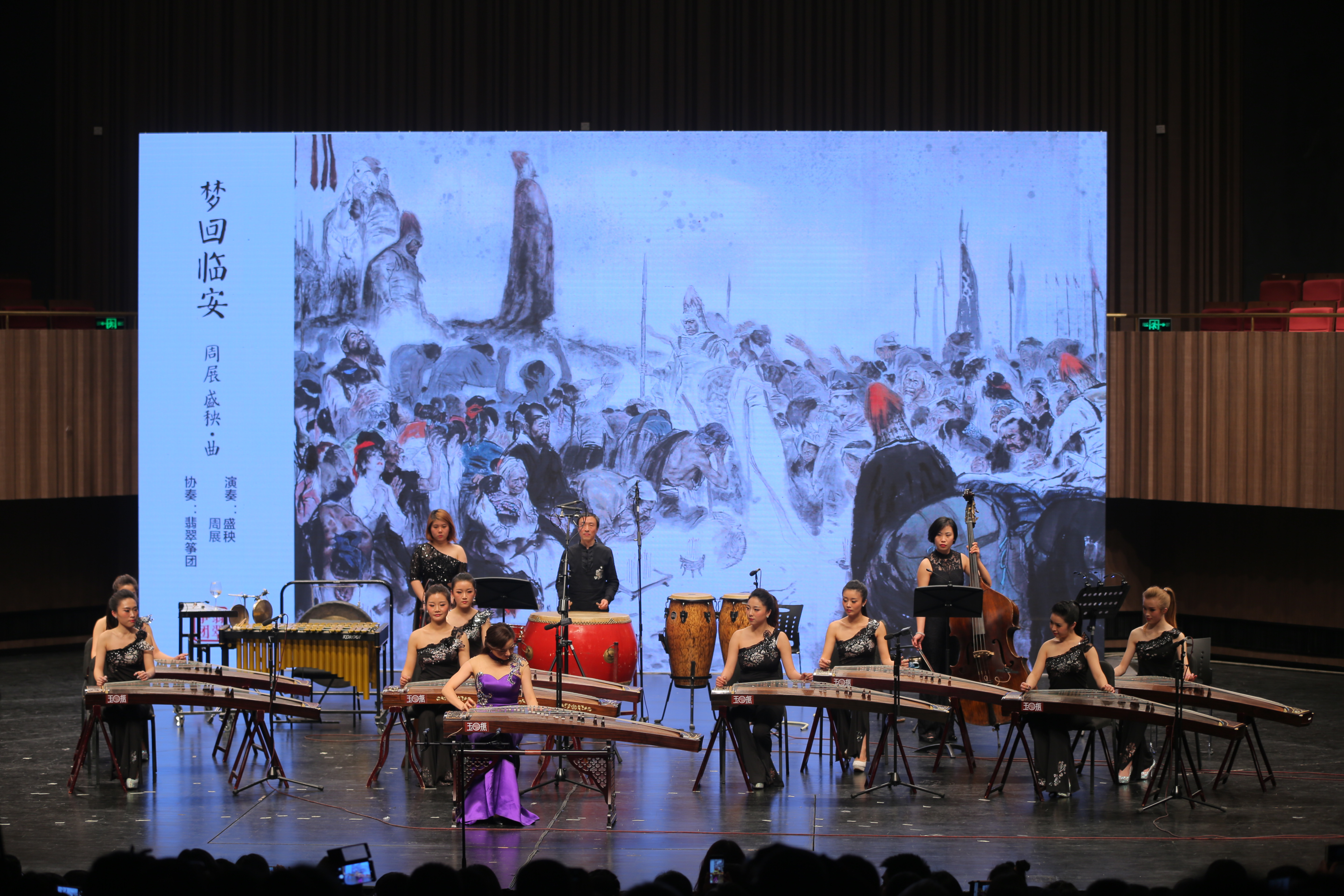 锣鼓喧天,筝乐欢腾。15把古筝配以锣、鼓等打击乐器同时奏响,让观众立刻感受到中国民俗音乐的精彩和魅力。下半场,第一首乐曲《三音四喜》是新民俗音乐对于中国民族器乐音乐在传统民间音乐上的继承、发展和创新,它融入了新音乐手段和语言,是一部古筝四重奏作品,旨在表现中国传统文化观念中久旱逢甘露、他乡遇故知、洞房花烛夜、金榜题名时的的人生四大喜事。《丝路·花语》是一首颇具流行风格的古筝、中阮、打击乐、钢琴合奏作品,通过将两把筝分别定出两个不同音阶,仿佛将人们带入了那个异域风情的花香细语之中。马来西亚作曲家钟启荣先生的作品《涌现的四季》,专为古筝四重奏、大阮、低音提琴和二位打击乐手而创作,翡翠筝团用诸多全新的音乐元素,如弓弦拉动古筝、水管甩动、用手指转动水杯等一系列音响声效,展现了一幅多彩的四季景象,动情的演奏让听众耳目一新。