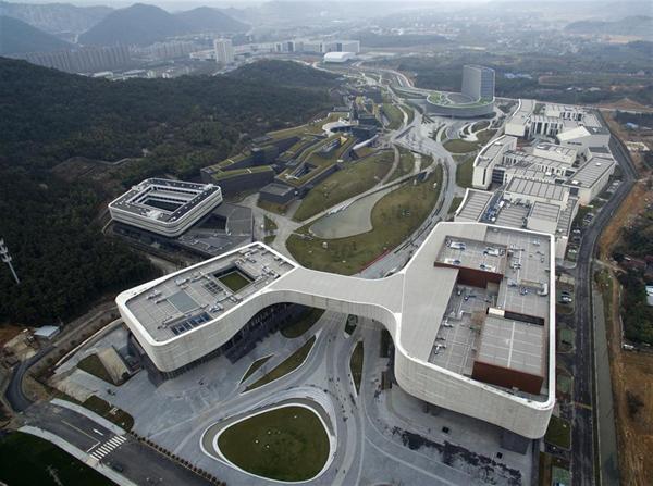 3月10日拍摄的浙江音乐学院的校园风景,画面前端的建筑是大剧院和音乐厅,外观模仿一把吉他。