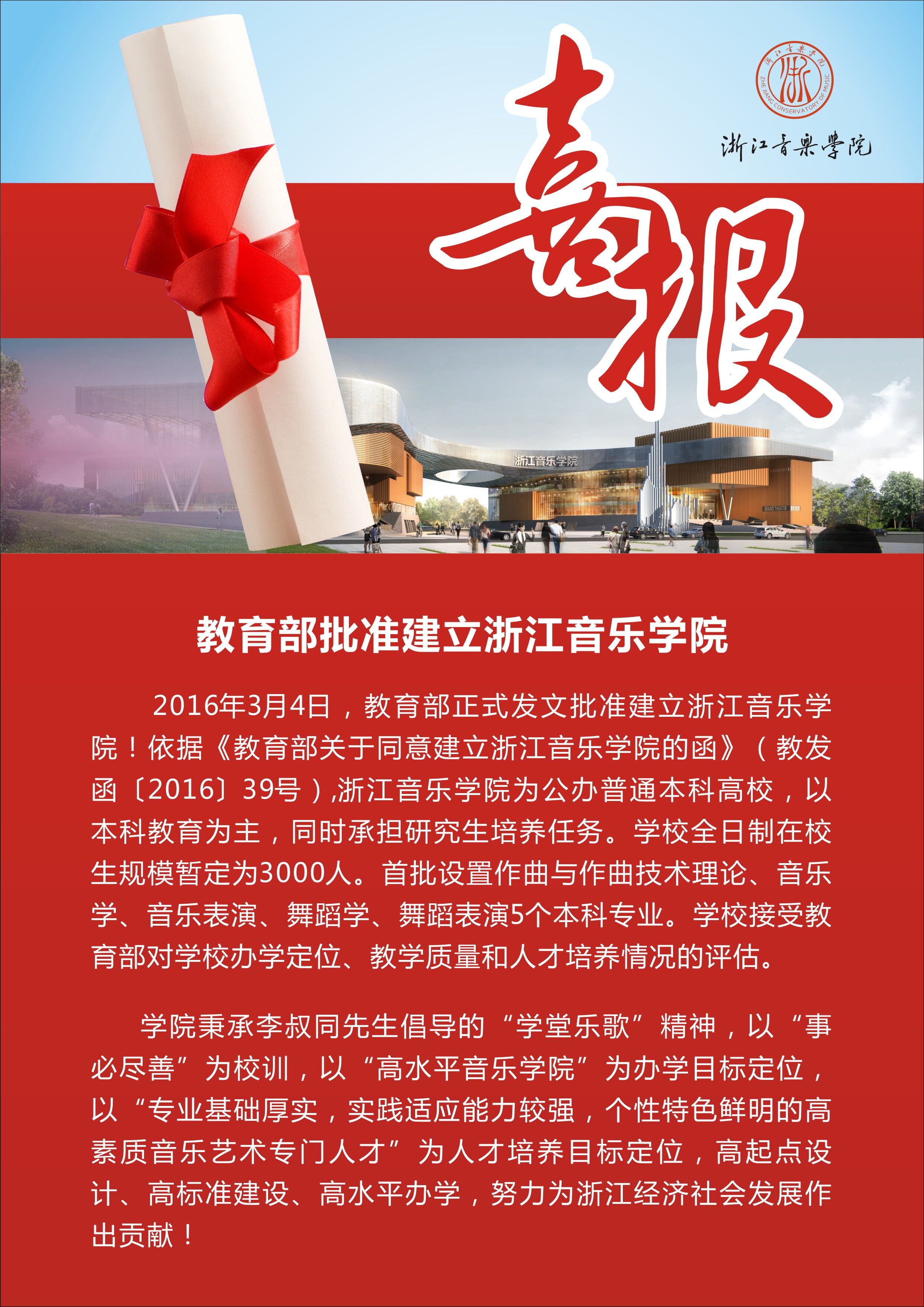 2016年3月4日,教育部正式发文批准建立浙江音乐学院!