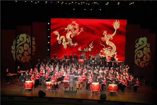 灯光由黯淡渐渐地变成明媚的中国红,几只栩栩如生的锦龙盘旋而上,来自民乐团的年轻乐手们齐聚一堂,演奏着管弦乐《龙腾虎跃》。当喜庆的唢呐吹响浙音成立的欢乐,当悠扬的二胡拉奏着乐美的律动,当流淌的古筝拨动了每一位建设者的心弦……龙腾虎跃、金振玉声;珠落玉盘,余音绕梁。在国乐系教师吴强的指挥下,晚会拉开磅礴、大气的序幕。