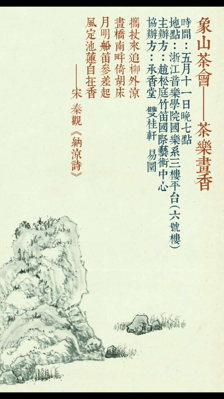 此时的象山仿佛一株静静地米兰,恬逸典雅而不失风韵。夜幕降临烛光摇曳,沉香袅袅茶色怡人。国乐系主任杜如松一曲箫独奏《莲台凝香》让观众们远离尘嚣,恍入仙境;第二首是传统作品《鹧鸪飞》,背景画面是林海锺先生听了杜如松的演奏,有感而作,音画互动、感人至深;由曹宇演奏的古琴名曲《梅花三弄》,展示了梅花雪白芳香、凌霜傲雪的高尚品质;由李跞演奏了令人荡气回肠的武曲《霸王卸甲》,袅袅余音在夜色中绕梁回荡,作品以其苍凉的意境、恢弘的气势将失败的楚霸王形象表现得淋漓尽致、惟妙惟肖。雅集活动在杜如松一曲《寒江残雪》中结束,月光如银,垂柳婆娑,乐曲再一次将人们带入悠远的意象中。