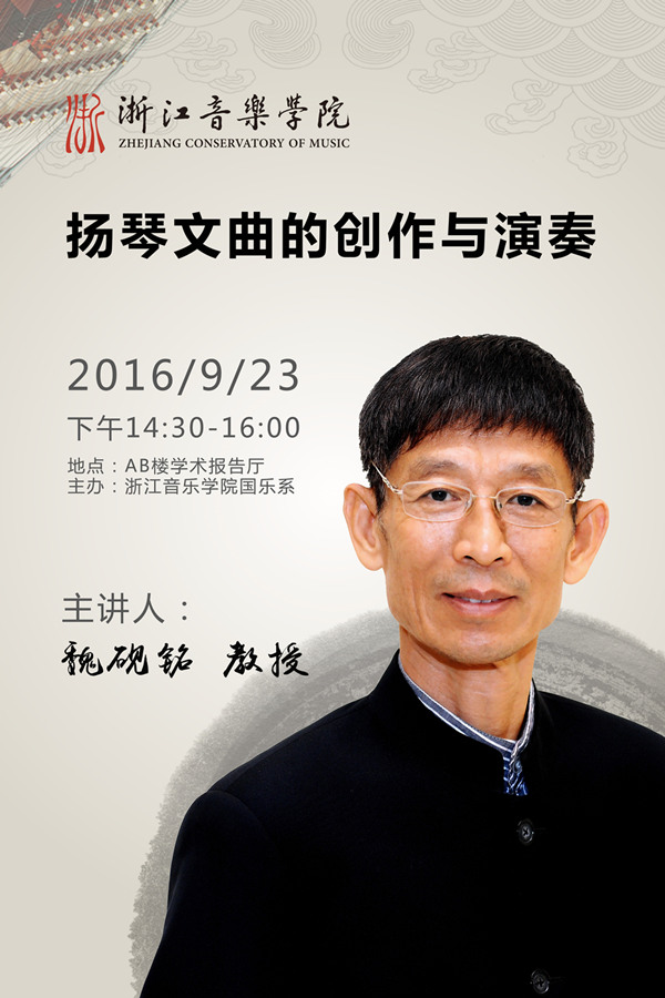 首页 > 校园文化 > 讲座论坛 扬琴文曲的创作与演奏 来源:国乐系 作者:国乐系 时间:2016-09-21 人气: 题目:扬琴文曲的创作与演奏时间:9月23日下午14:30—16:00地点:AB楼学术报告厅主办单位:浙江音乐学院国乐系人物名片:魏砚铭教授曾为天津音乐学院弹拨教研室主任,中国扬琴教育学会理事,师从李泽昆,郑宝恒、刘光泗等名家。现为天津音乐学院客席教授,天津师范大学客席教授,新加坡莱佛士音乐学院华乐指挥,扬琴教授.新加坡南洋艺术学院扬琴高级讲师,新加坡华乐总会理事,新加坡扬琴学会主席。 返回 打印 下一篇: