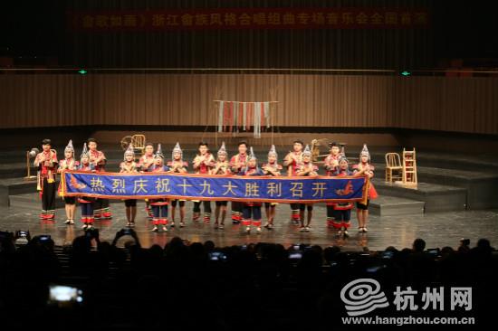 十九大召开当晚,浙江音乐学院的音乐厅内座无虚席,《 畲歌如画——浙江畲族风格合唱组曲 》音乐会正在进行着。据了解,此次音乐会是浙江音乐学院“喜迎十九大,浙音献天籁”系列演出活动之一。在喜迎党的十九大之际,浙江音乐学院整合资源,举全系之力,历时1年多筹备,精心策划,献上了十月颂歌。