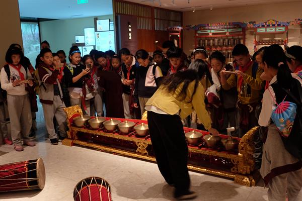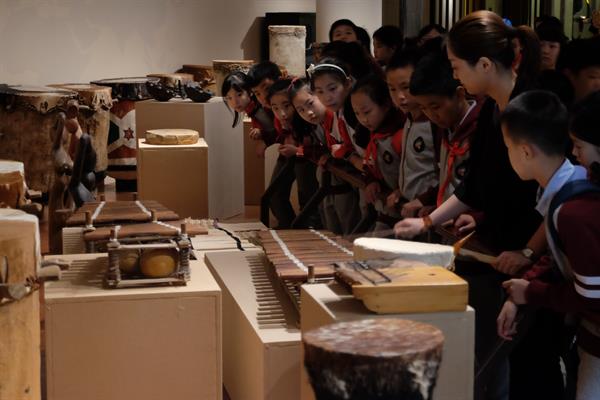 在博物馆老师的带领下,学生们饶有兴趣地参观了音乐博物馆的四个展区,认真听取了老师对每一件乐器的讲解,好奇地提出了许多疑问,还用手机记录了各种“新奇”乐器和它的介绍。在参观晋候苏编钟、曾侯乙编磬时,学生们积极参与关于音乐知识的互动问答。在老师的指导下,敲击编钟、编磬,细细聆听这些古乐器发出的美妙声音。学生还对脸谱墙、加美兰乐队、非洲乐器等区域的乐器十分感兴趣。