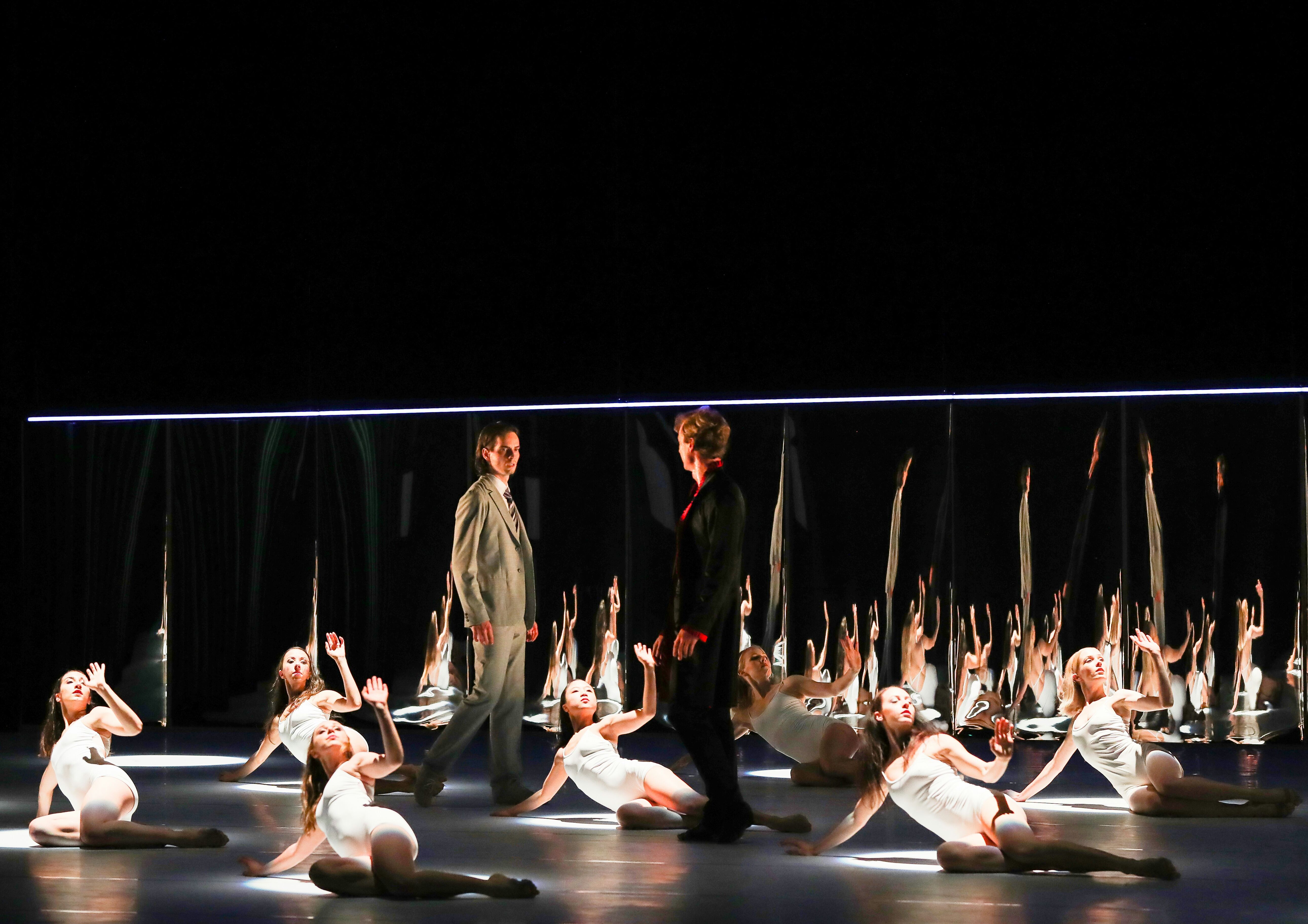 光影交织着,宁静的湖面在舞台地板上流动,光线浮动,掠影斑斑,仿佛有微风吹过,仿佛有阳光照耀。故事在冰冷的白光照耀下开启,男主角Siegfried王子被自己身患绝症的消息击打得痛苦不已,他体内的另一个黑暗的分身出现了,在鲜红的幕布间穿梭,在懊恼的王子心头,注入迷茫扰乱人心的墨色。场景切换,各色男女正旋转着肆意的舞步,在热闹的灯光下,在热烈的节奏里,绽放着与王子格格不入的欢雀。他们时而统一时而凌乱的步伐,在配乐的烘托下,在光圈的舞动中,张扬地充满了整个舞台。与古典舞剧不同,这部《黑与白》处处展现着革新和创意。没有芭蕾纱裙的裙摆,没有天鹅洁白的羽毛,没有王子笔挺的制服,有得只是出其不意的舞步、撕心裂肺的斗争和迷茫挣扎的内心独白。舞台上投影出的镜像恍惚斑驳,像极了王子恍惚的精神状态,迷惑着人们的心扉。