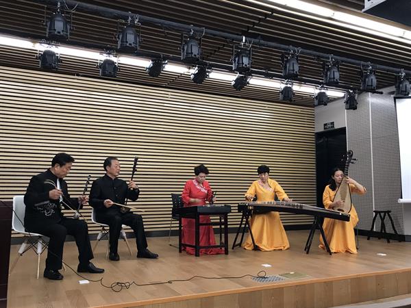 图书馆馆长孟凡玉教授致辞,并对琴筝清曲的历史积淀、八板体结构、琴书曲牌等内容进行了简要介绍,为讲座的顺利展开做了良好的铺垫。