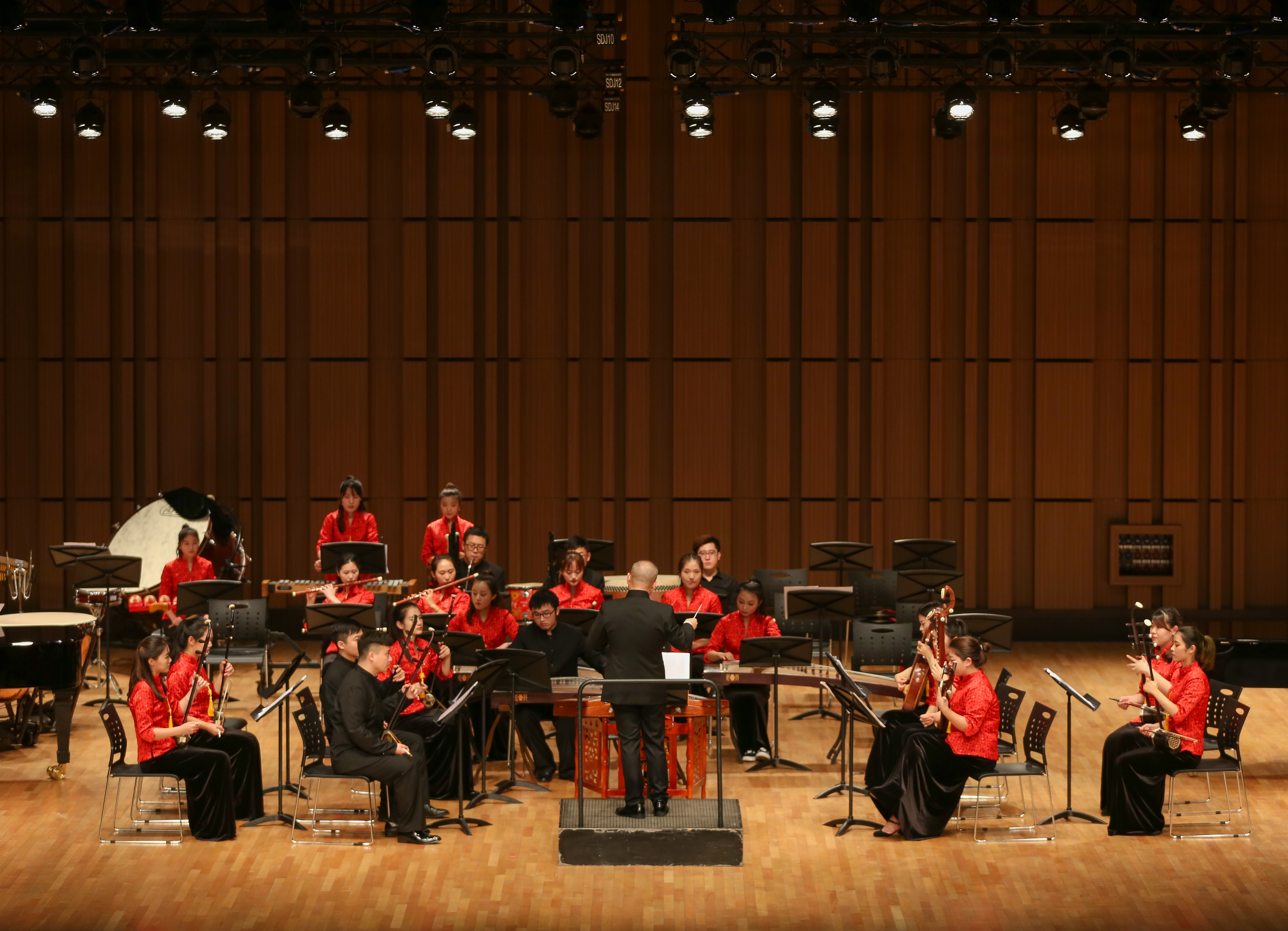 汇报演出在经典震撼的《好汉歌》中拉开了演出的序幕。实习民乐队精彩地演绎了欢快热烈的经典民族打击乐曲,不同民间乐器的交织碰撞,色彩丰富,不断变换的节奏,音程的大跳,一次次将现场气氛推向高潮。弹拨乐合奏《弹起我心爱的土琵琶》表演精细入微,充分利用乐器演奏技巧,发挥乐器最大表现效果,创造了鲜明的音乐形象,展现了乐曲的独特艺术魅力。《阿细欢歌》由申晟和普天庆进行演奏,阮铭乔扬琴伴奏,二笙重奏使乐曲新颖别致,丰富了笙演奏的表现力,扬琴音色清脆,给观众带来试听享受。由王璇、刘晓敏等同学为观众带来了古筝重奏《弥渡山歌》,用独具特色的古筝、笙等民族乐器,描绘出一个个时刻、一个个季节的真实的情景。《跑旱船》是我国传统器乐音乐的典范,传承了我国的传统文化,赵一格、高雅琳、李梓铱、吴尚语等4人用笛子来对话,将这首《跑旱船》演绎得活灵活现,让观众们感受到了喜悦之情。《战马奔腾》由魏璐、李晓、朱蓉儿、陈家田、王方程、倪俊森、周乃奇等7位同学用二胡重奏的形式向大家表达出骑兵战士英勇顽强、一往无前的战斗精神。《青春舞曲》是一首广为传唱的新疆民歌,作曲与指挥系潘思伊同学改编后的钢琴五重奏将中西方特色巧妙地结合起来,为这首短小精炼的舞曲增添了一份异域色彩。《乡谣》选自歌剧《野火春风斗古城》取材于河北民歌《小白菜》,具有浓郁的河北民歌韵味,声乐歌剧系陈旭晗和陈良同学为观众再现经典,动听的歌声将观众带入乡田林间,体会了《乡谣》的浓情蜜意。《茉莉花》是我国最经典的曲目之一,作曲与指挥系的余冰洁同学将这首传统民歌改编为管弦乐曲,由沈羽嘉、屠晟等人以柔和的旋律将这首管弦乐曲《茉莉花》完美地演绎了出来。声乐歌剧系张若琳、彭展翔、李秉泽、欧瑜嫔精彩地演绎了歌剧中的经典唱段《我听到了什么》,幽默诙谐的对白,将人物形象刻画得淋漓尽致,凸显出各人物形象的独特性格和情感。张若琳、高艺芳同学以一首苏珊娜和伯爵夫人的二重唱《微风轻抚的时光》从声部与音色的有机融合中展示出歌剧非凡的魅力,将戏剧气氛推向高潮。