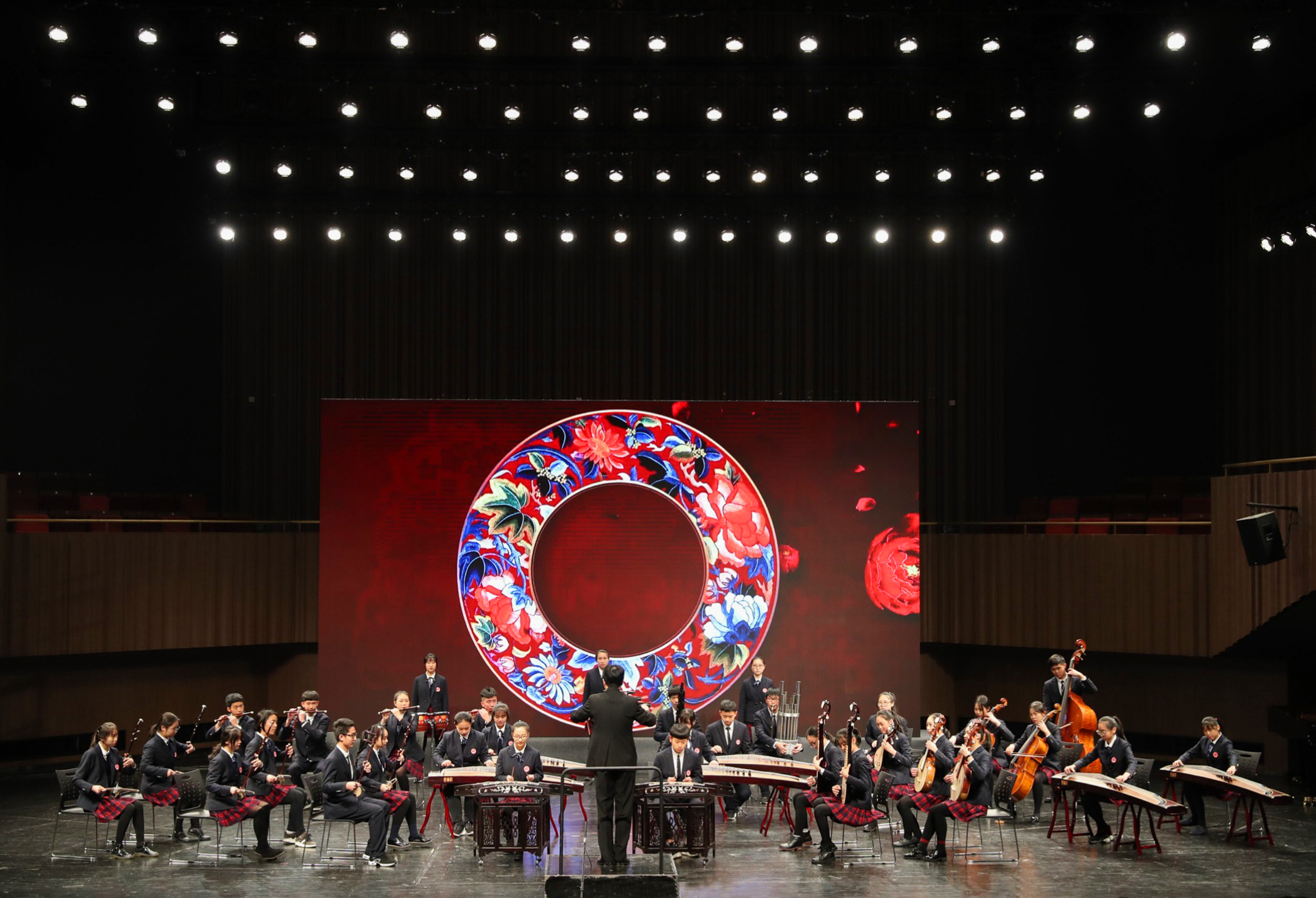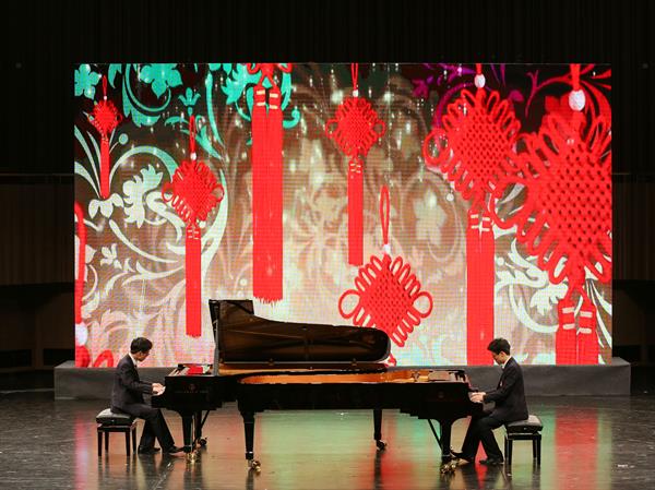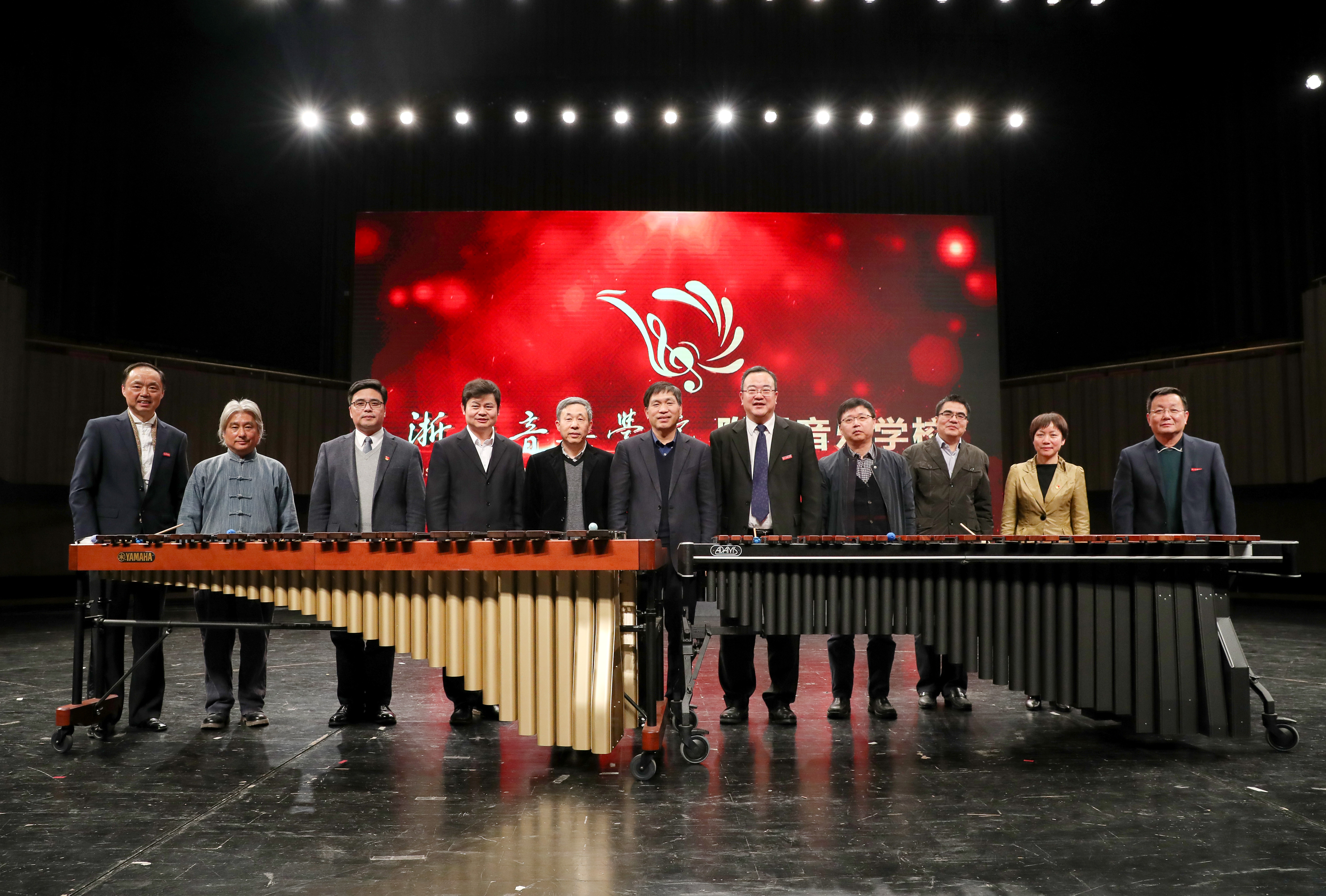 揭牌仪式以庆祝音乐会的形式贯穿始终,充分展现了学院附中的办学特色。整场庆祝音乐会分为“笑脸”、“思考”、“展望”三大篇章,每一篇章都以精心制作的主题VCR开篇,全面回顾了附中的筹建历程,全方位阐述了附中的办学初衷、办学理念、办学目标和办学特色,并带来了各大音乐院校附中校长们对浙音附中的美好祝愿。庆祝音乐会在民乐合奏《喜洋洋》中拉开序幕,欢快的节奏和师生们精彩的演绎瞬间点燃了音乐厅的气氛。古琴独奏《流水》、琵琶独奏《龙船调》、钢琴独奏《晨歌》、《贝多芬钢琴三重奏》、弦乐重奏《莫扎特嬉游曲》、双钢琴弹奏《生日歌》和《欢乐中国节》,由附中师生精心准备的精彩节目依次呈现在来宾面前,充分展示了师生的教学成果和艺术风采,也博得了全场观众的阵阵掌声。现场,还特邀流行音乐系学生叶炫清带来女声独唱《致青春》,动情的演唱感染了在场每位观众。在揭牌仪式环节,到场领导一同敲击马林巴,以一种特殊的方式,与全场观众一起共同见证学院附属音乐学校的正式成立。最后,在《共圆中国梦》和《我爱你中国》的歌声中,庆祝音乐会圆美落下帷幕。