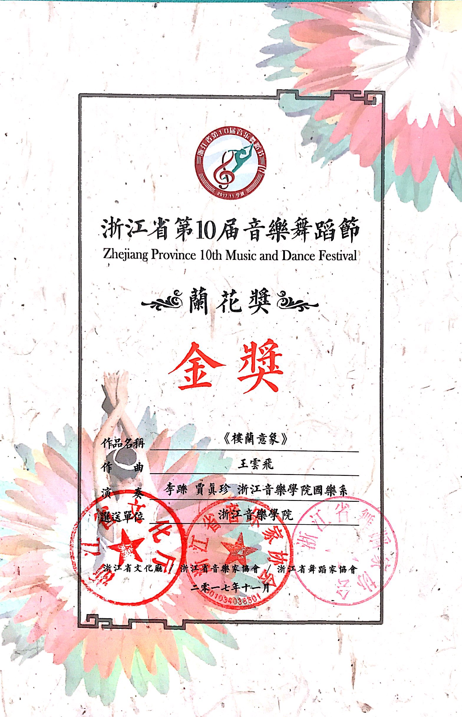 近日,由浙江省文化厅、浙江省音乐家协会、浙江省舞蹈家协会主办,宁波市新闻广电出版局承办的浙江省第10届音舞节在宁波圆满落幕。我院选送的作品共获兰花奖金奖2个、银奖5个、铜奖4个,其中二胡协奏曲《无极》、协奏曲《楼兰意象》荣获民族器乐类金奖,歌曲《望江阁》荣获声乐类银奖,小提琴、单簧管、钢琴三重奏《春醒》荣获西洋器乐类银奖,舞蹈《梦蝶飞舞》《山哈女》《浔山行》荣获舞蹈类银奖,歌曲《看你的眼》荣获声乐类铜奖,室内乐《旷野之声》、木管五重奏《班列飞驰》荣获西洋器乐类铜奖,舞蹈《滚滚男儿》荣获舞蹈类铜奖。