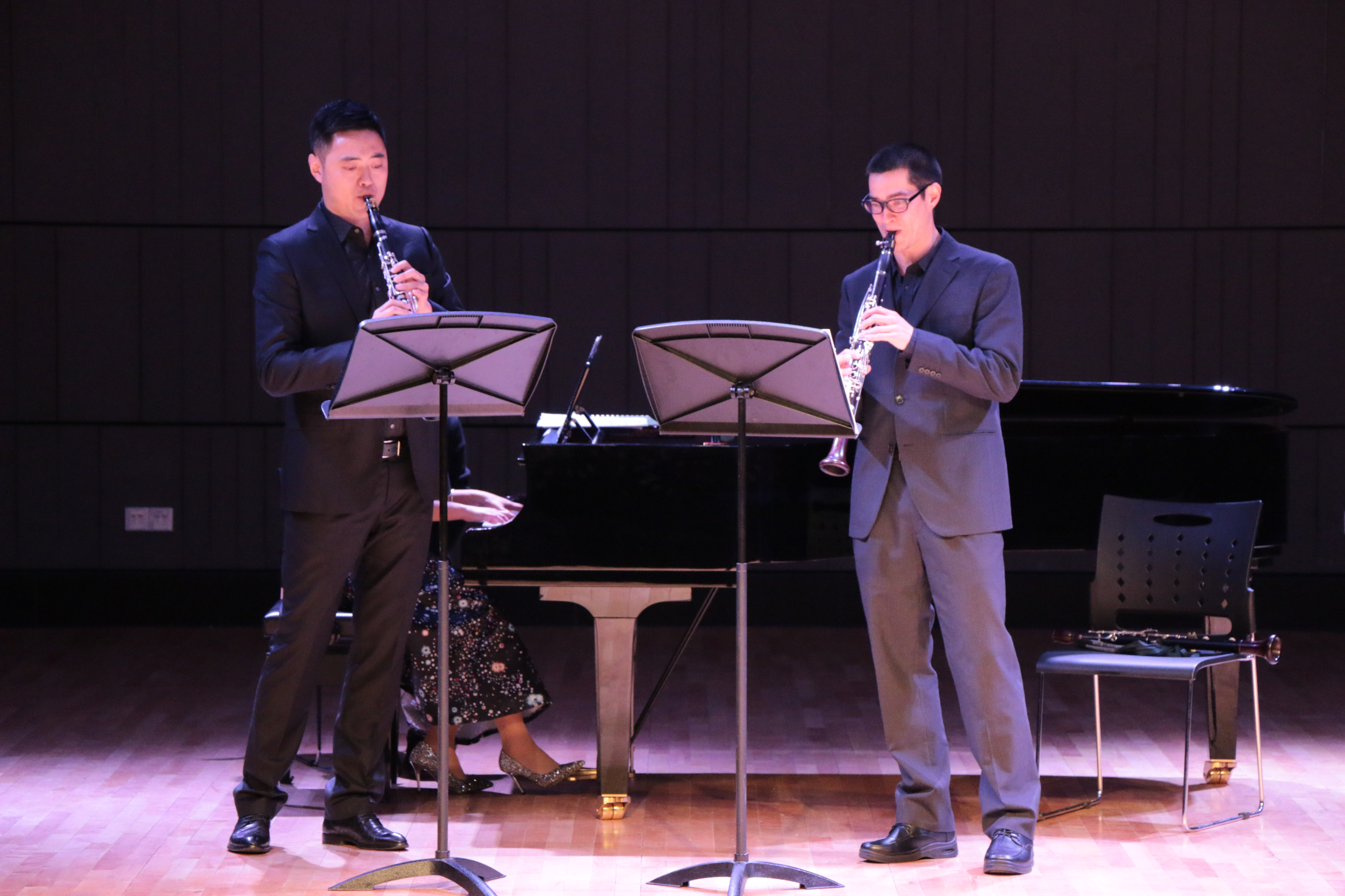 音乐会上,信雄演奏了韦伯的《大二重音乐会协奏曲》(为钢琴与单簧管而作)、格什温的《三首前奏曲》以及普朗克的《奏鸣曲》。他动听的音色和精湛的技艺,以及高雅的音乐境界,成功俘获了在场所有人的耳朵,将听众带入神圣的音乐圣殿。信雄还邀请我院青年教师单小明共同演奏了门德尔松的《二重奏小品》(op.113 ),他们奏出的优美旋律交织在一起,将现场气氛推向高潮。音乐会由管弦系艺术指导教师齐笑怡担任钢琴演奏。