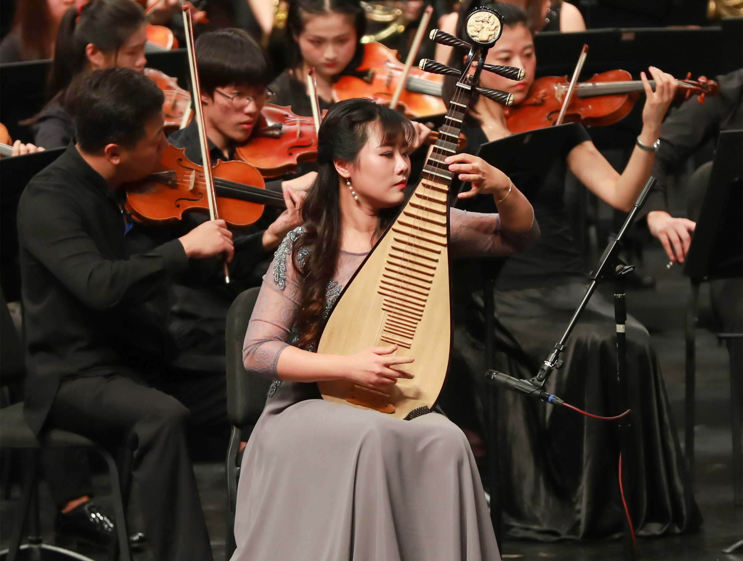 随着高健先生挥动起指挥棒,音乐厅内响起动情的旋律,由青年教师和优秀学生组成的交响乐团的演奏味道醇厚、内劲十足,这首中国红色经典曲目《红旗颂》一奏响,便赢得了开门红。优美的旋律展现了瑶族民众欢歌热舞的喜庆场面,一曲《瑶族舞曲》带听众走进了瑶族人民的生活,感受着那份生活的喜悦。琵琶邂逅交响乐,一曲由杨婧带来的琵琶协奏曲《草原小姐妹》,音乐形象鲜明,意境辽阔而宽广,具有极大的张力与表现性。“北方那个吹,雪花那个飘”,《白毛女》的旋律扣人心弦,抒情的音乐煽动着听众的内心,令人为之动容。
