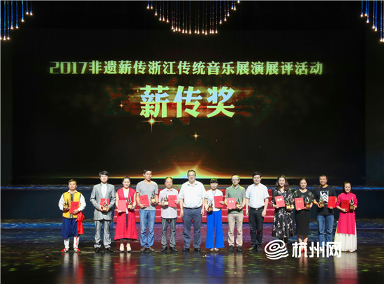 活动现场,高如丰、楼正寿、沈凤泉、朱大祯、顾友珍、蓝陈启、郑云飞等7位对浙江传统音乐传承发展做出特别贡献的国家级非遗代表性传承人被授予“浙江传统音乐传承特别贡献奖”;江南丝竹《欢乐歌》等11个节目荣获“非遗薪传”——浙江传统音乐展演展评活动“薪传奖”;缙云丝竹锣鼓《花头台》等11个节目荣获“非遗薪传”——浙江传统音乐展演展评活动“优秀入选奖”;渔工号子《阿拉抲鱼人》等6个节目荣获“非遗薪传”——浙江传统音乐展演展评活动“最具人气奖”。