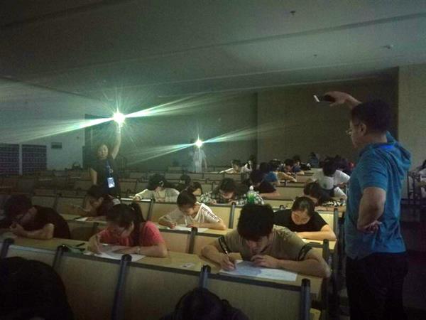 6月24日是学院学期期末理论课考试最后一天。上午10:10,考场外雷电交加,突然校园出现大面积断电,人文楼各考场顿时一片漆黑。为确保考试正常进行,正在巡考的学院副院长杨九华现场指挥应急处置,教务处张云良处长、陈沛副处长带领相关巡考人员及时采取措施,稳定考生情绪,打开考场窗户,以保证考场最大限度透光,将考生座位全部调整至靠窗一侧。现场监考及巡考教师们纷纷将自己的手机灯光功能打开,高高举起,为考生照亮,考生们都非常配合,安静有序地认真考试。老师们高举着手机,右手累了换左手,坚持了半个小时,直到供电恢复。现场考生纷纷点赞老师们,并给予了高度评价。