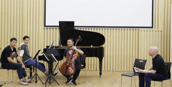 Kai教授分别从作品的演奏技法与音乐表现等方面进行了悉心讲解。他介绍了作曲家的创作背景,明确了作品的演奏技法,再指导学生以情带乐,更好地诠释作品的音乐内涵。Kai教授还以现代重奏作品为例,结合贝多芬的创作特点,指导学生在演奏贝多芬作品时注重速度、和声等要素,避免一味地演奏音符。Kai教授特别强调了室内乐艺术中合作的重要性,无论是三重奏、四重奏均是一个整体,其中每个声部要相互配合,不可喧宾夺主,演奏者要使节奏和音准统一,技法与情感统一,才能更好地用音乐感染听众。