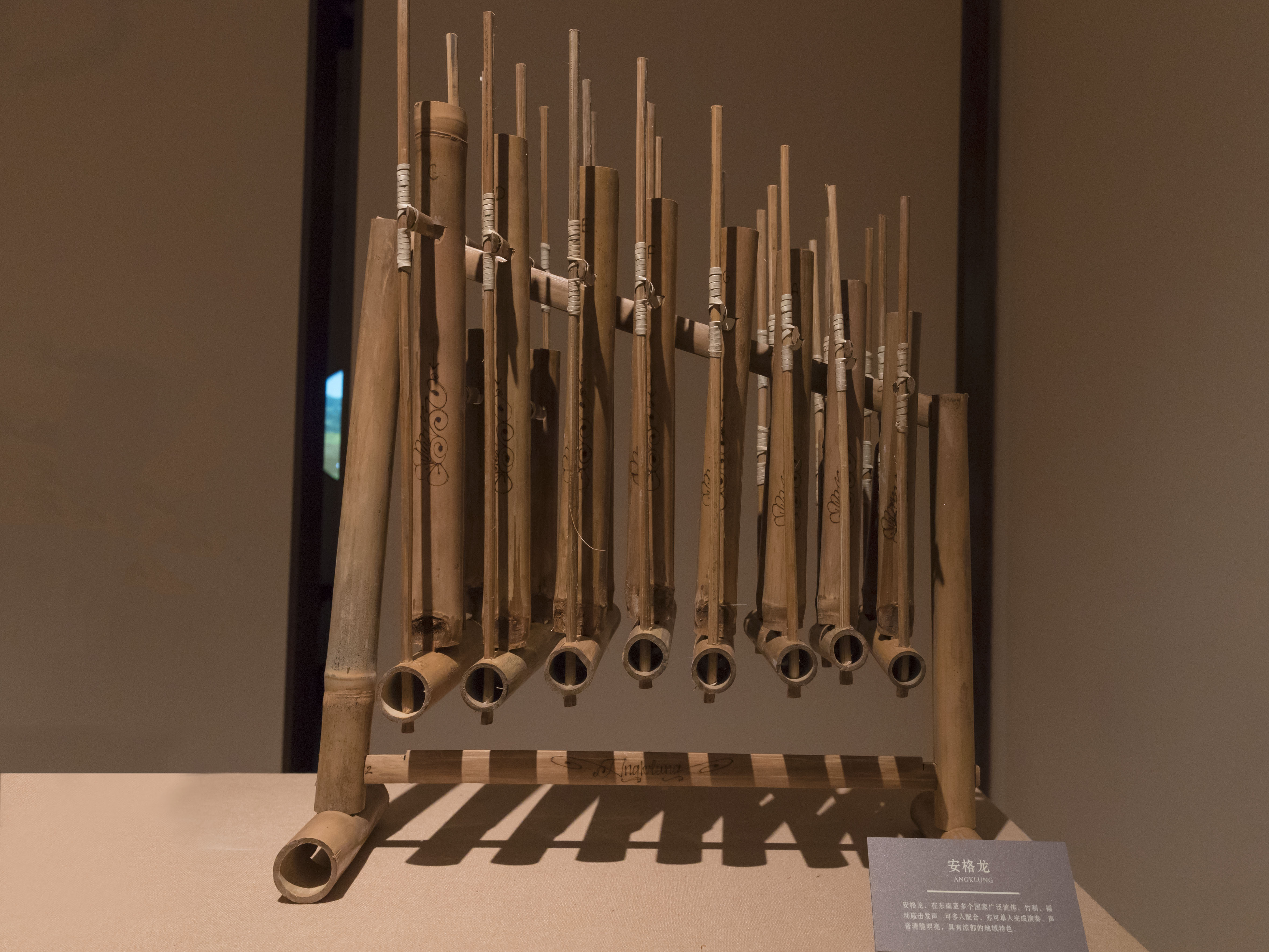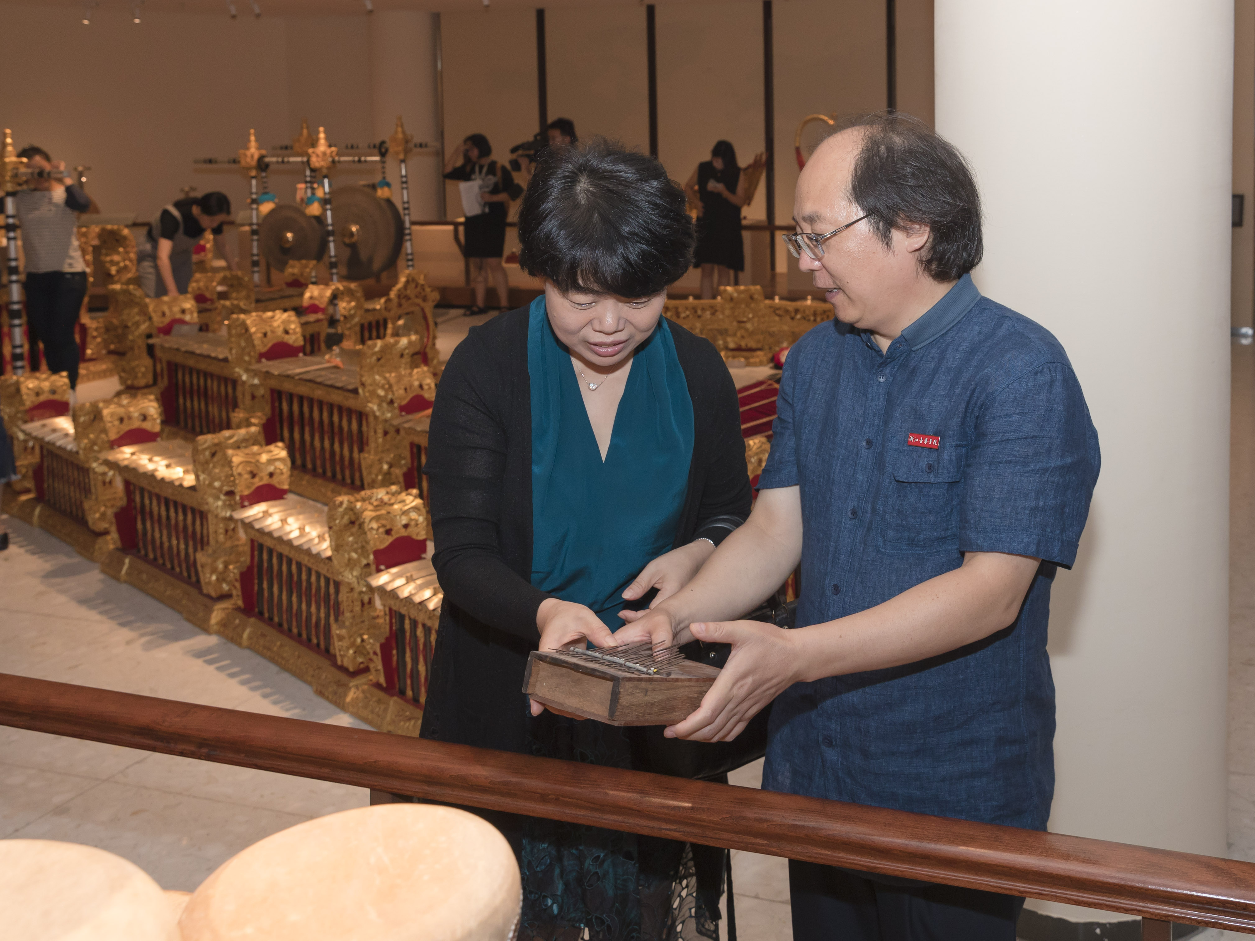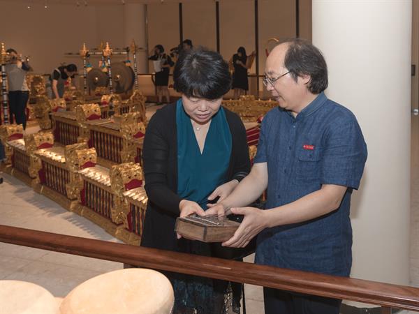“勤打听、广搜罗”,靠着平时一点一滴的积累,浙音音乐博物馆还从世界各地收罗了很多奇珍异宝。在“八面来风”展区,苏丹木琴、葫芦木琴、弯琴、安格龙等异域乐器让参观者眼前一亮,“世界各地的音乐文化艺术真得是五彩斑斓,很多乐器从演奏手法、表现形式、音色音准等各方面都与中国乐器不同,像印尼的佳美兰乐器,就很有特色。作为金属乐器为主体的合奏音乐,它是印尼最具有代表性的音乐形式。”孟凡玉馆长边解释边为大家表演起来。
