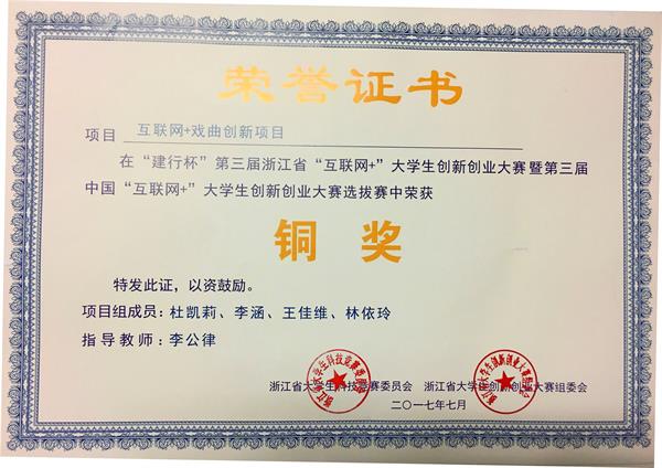 首页 > 浙音新闻网 > 浙音要闻 我院学子荣获第三届浙江省“互联网+”大学生创新创业大赛铜奖 来源:创业学院(筹) 作者:创业学院(筹) 时间:2017-09-26 人气: 近日,第三届浙江省“互联网+”大学生创新创业大赛圆满落下帷幕,我院戏剧系学生杜凯丽参与“互联网+戏曲创新项目”摘得铜奖。本次大赛由浙江省大学生创新创业大赛组委会主办,大赛的主题为“搏击‘互联网+’新时代壮大创新创业生力军”为主题,旨在深化高等教育综合改革,激发大学生的创造力,培养造就“大众创业、万众创新”的生力军,促进“互联网+”新业态形成,服务经济提质增效升级,以创新引领创业、创业带动就业,推动高校毕业生更高质量创业就业。 返回 打印 下一篇: