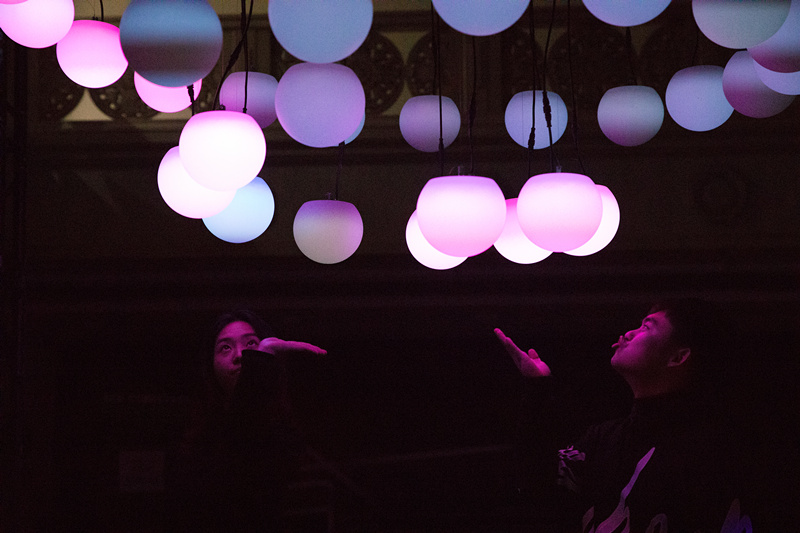 作品《云》意在让人们去感知、想象来自云的声音。“行到水穷处,坐看云起时”,而云的结束,又是水的开始。境遇的转化,生生不息。《云》这是一个集合了灯光与声音的交互式声音装置作品,当参观者立足于灯光装置之下,声音和光随即被触发,并随着参观者的移动发生相应变化。