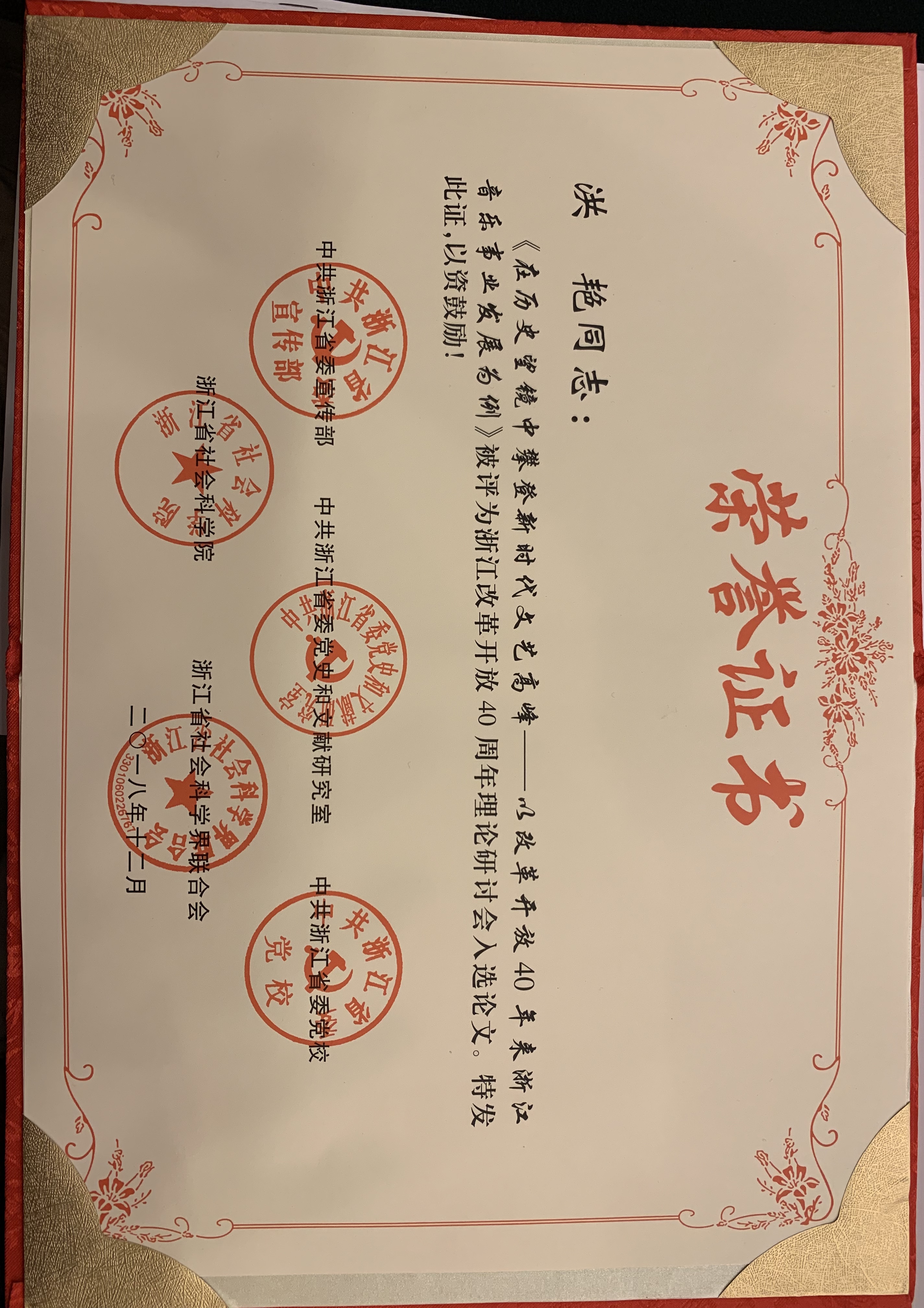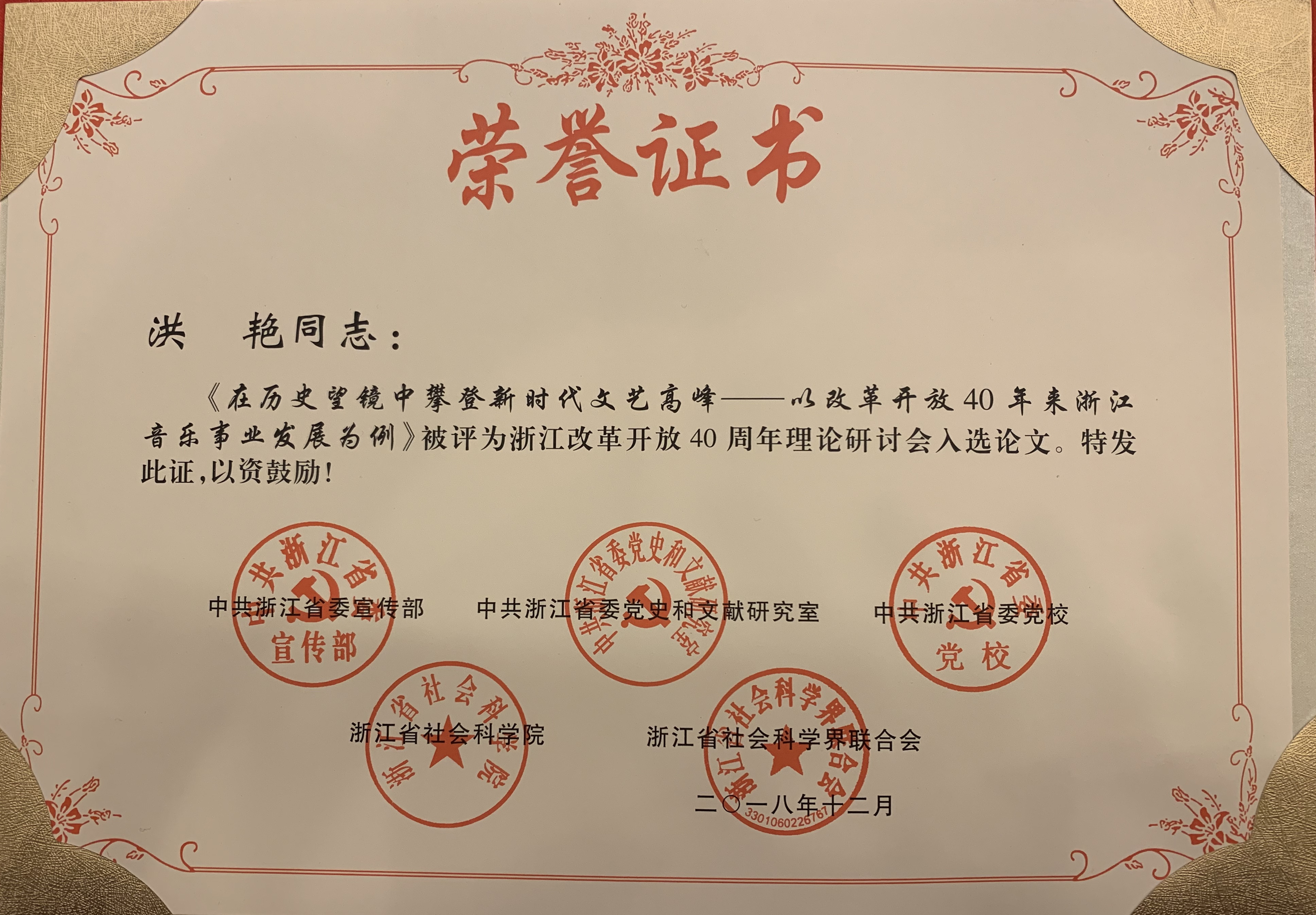 为深入学习贯彻习近平总书记在庆祝改革开放40周年大会上的重要讲话精神,总结浙江40年来改革开放的宝贵经验,12月28日,由省委宣传部、省委党史和文献研究室、省委党校、省社科院、省社科联联合主办的浙江改革开放40周年理论研讨会在杭州举行。会议通报了浙江改革开放40周年理论征文入选论文。我院音乐学系教师洪艳的论文《在历史望镜中攀登新时代文艺高峰——以改革开放40年来浙江音乐事业发展为例》成功入选。