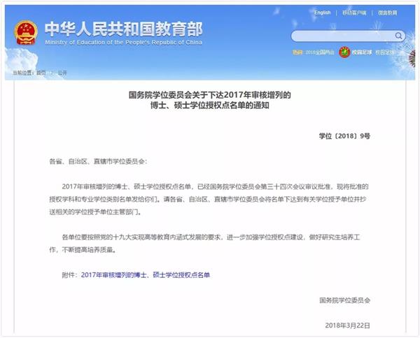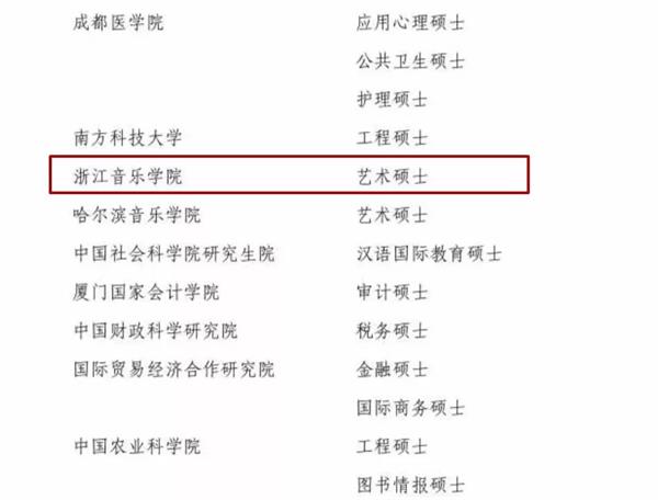 首页 > 浙音新闻网 > 浙音要闻 学院新增为艺术硕士专业学位研究生培养单位 来源:研究生处 作者:研究生处 时间:2018-03-29 人气: 日前,《国务院学位委员会关于下达2017年审核增列的博士、硕士学位授权点名单的通知》(学位〔2018〕9号),公布了各学位授予单位在2017年审核增列的博士、硕士学位授权点名单。我院经国务院学位委员会批准新增为艺术硕士专业学位研究生培养单位。至此,我院已拥有硕士学位授权一级学科(音乐与舞蹈学)和艺术硕士专业学位类别,学位与研究生教育迈上了一个新台阶。 返回 打印 下一篇: