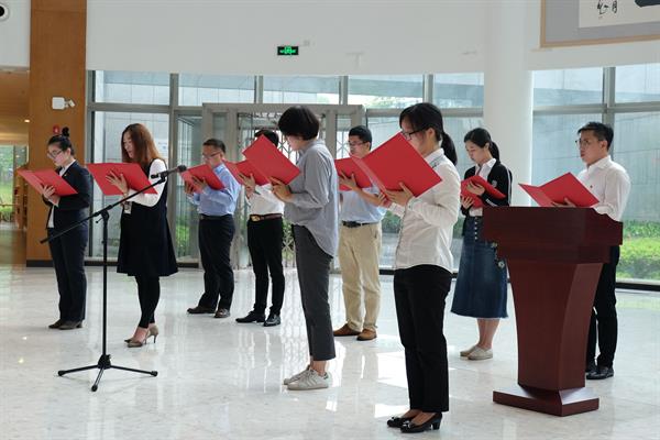 机关党总支10名教职工代表共同宣读《浙江音乐学院建设“书香机关”活动倡议书》,倡议机关全体教职工以书为友,以书为伴,共同打造一个书香充盈、人文关怀、充满活力的“书香机关”。