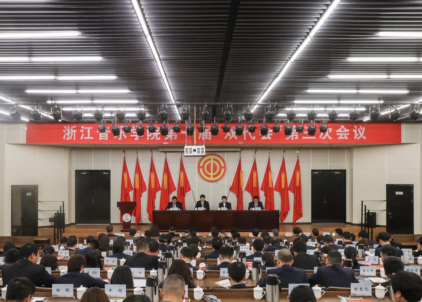 张建国代表学院向大会作了题为《深化改革促发展 提高质量上水平奋力谱写“高水平一流”音乐学院建设新篇章》的工作报告。他简要回顾了学院一年来各项工作所取得的成绩,指出中国特色社会主义进入了新时代,给我们的教育事业和文化事业发展提供了前所未有的战略机遇,浙江的高等教育强省建设和文化浙江建设都站在了新的历史起点。浙音作为浙江省第一所音乐艺术高等院校,承载着立德树人和繁荣发展社会主义文艺的双重使命,责任重大,使命光荣。我们一定要围绕“高水平一流”办学目标定位,全面落实立德树人根本任务,加快推进内涵式发展,努力为中国特色社会主义事业发展培养更多高素质的音乐艺术专门人才;同时紧扣文化浙江建设战略目标,坚持以人民为中心,主动服务,为社会主义文化事业发展和文化浙江建设贡献浙音力量。