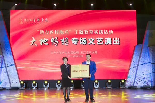 活动上,挂牌成立“浙江音乐学院思政理论课实践教学基地”。贾秀英代表学院将“浙江音乐学院思政理论课实践教学基地”牌授予海宁市盐官镇桃园村。