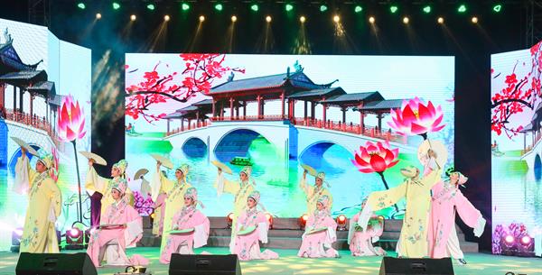演出在盛大恢宏的民乐合奏《龙腾虎跃》中开场,乐曲情绪炽热,民族风格浓厚,是中国锣鼓乐的经典名曲,乐曲主题以浙东锣鼓《龙头龙尾》的音调为素材加工而成,各种不同鼓的音色和节奏的多样组合,经过富有激情的演奏,渲染了气势壮阔的欢腾场面,主题旋律与鼓声交相奏鸣,震撼人心,表现了人民龙腾虎跃,奋勇前进的风貌。随后,学院师生陆续上演女声独唱《绿水青山》、女子群舞《梦蝶飞舞》、男生小组唱《茉莉花》、越剧选段《梁祝·十八相送》、琵琶独奏《十面埋伏》、女声独唱《从前慢》、男子群舞《草原汉子》、越剧《西园记》选段“自从与张君见一面”、唢呐与笙《百鸟朝凤》、男生表演唱《唱进洋》等精彩曲目。象山百姓也表演了地域风情浓郁的文化作品,如象山乱弹《赵匡胤十八悔》音色高亢激昂,充分展现了发源于象山的戏曲唱腔“乱弹”的文化魅力;情景歌舞《堵港情》生动再现了象山百姓不怕苦、不怕难,堵港填海、围海造田的奋斗场景,以及他们弘扬新时代围垦精神,建设美丽田园,打造璀璨象南的美好追求。