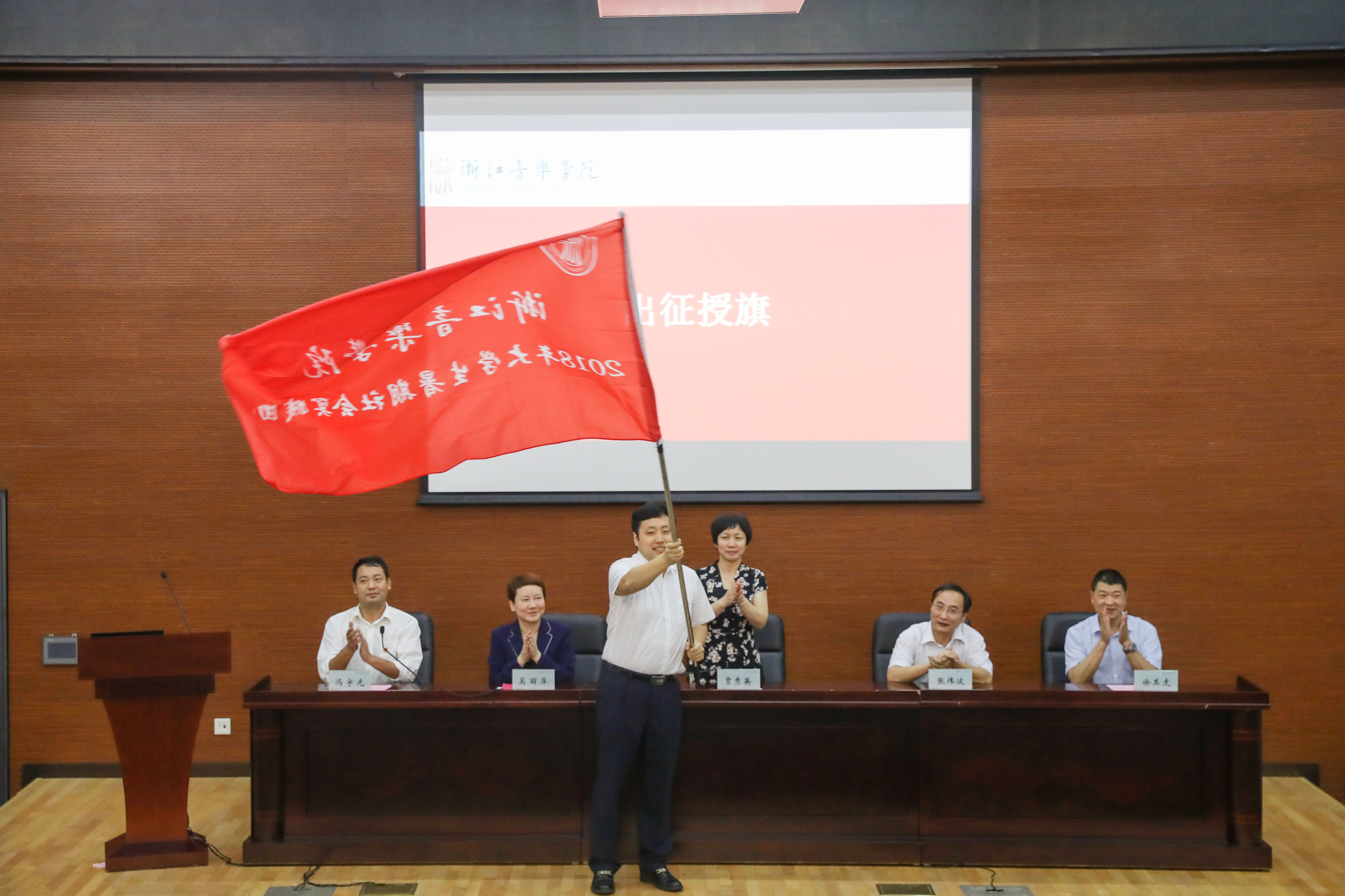 贾秀英宣布2018年大学生暑期社会实践暨“双百双进”活动正式启动,并为实践团队代表授旗。
