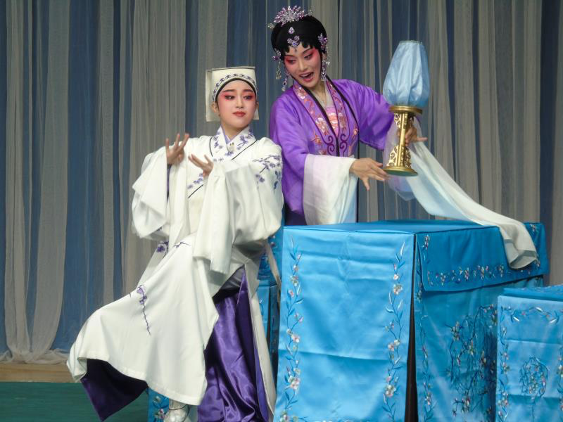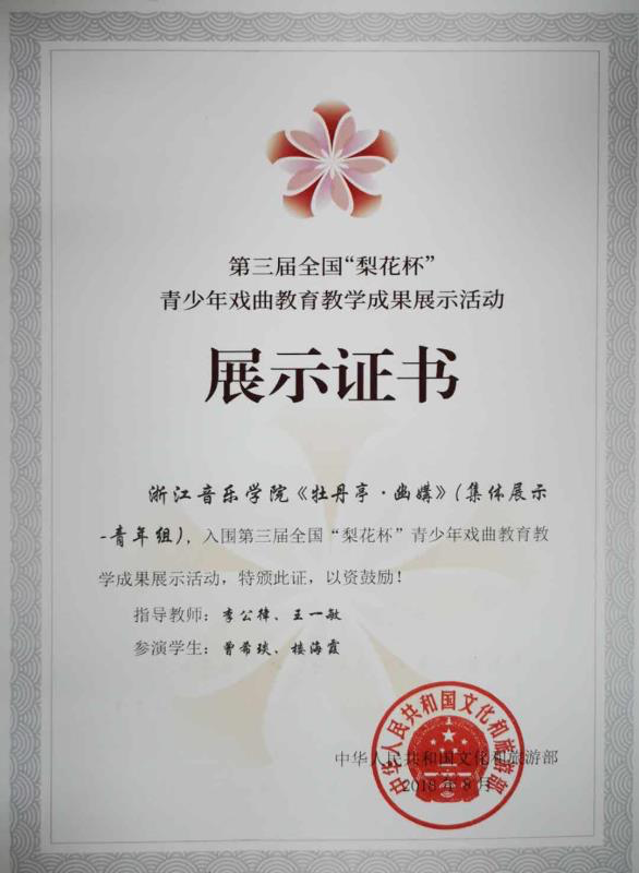 8月20日至24日,由文化和旅游部主办,文化和旅游部文化科技司、中国戏曲学院承办的第三届全国“梨花杯”青少年戏曲教育教学成果展示活动在北京举行。由我院戏剧系教师李公律、王一敏指导的2017级越剧演员班曾希琰、楼海霞等同学共同演出的越剧折子戏《牡丹亭·幽媾》入选本次戏曲教学成果展示活动。