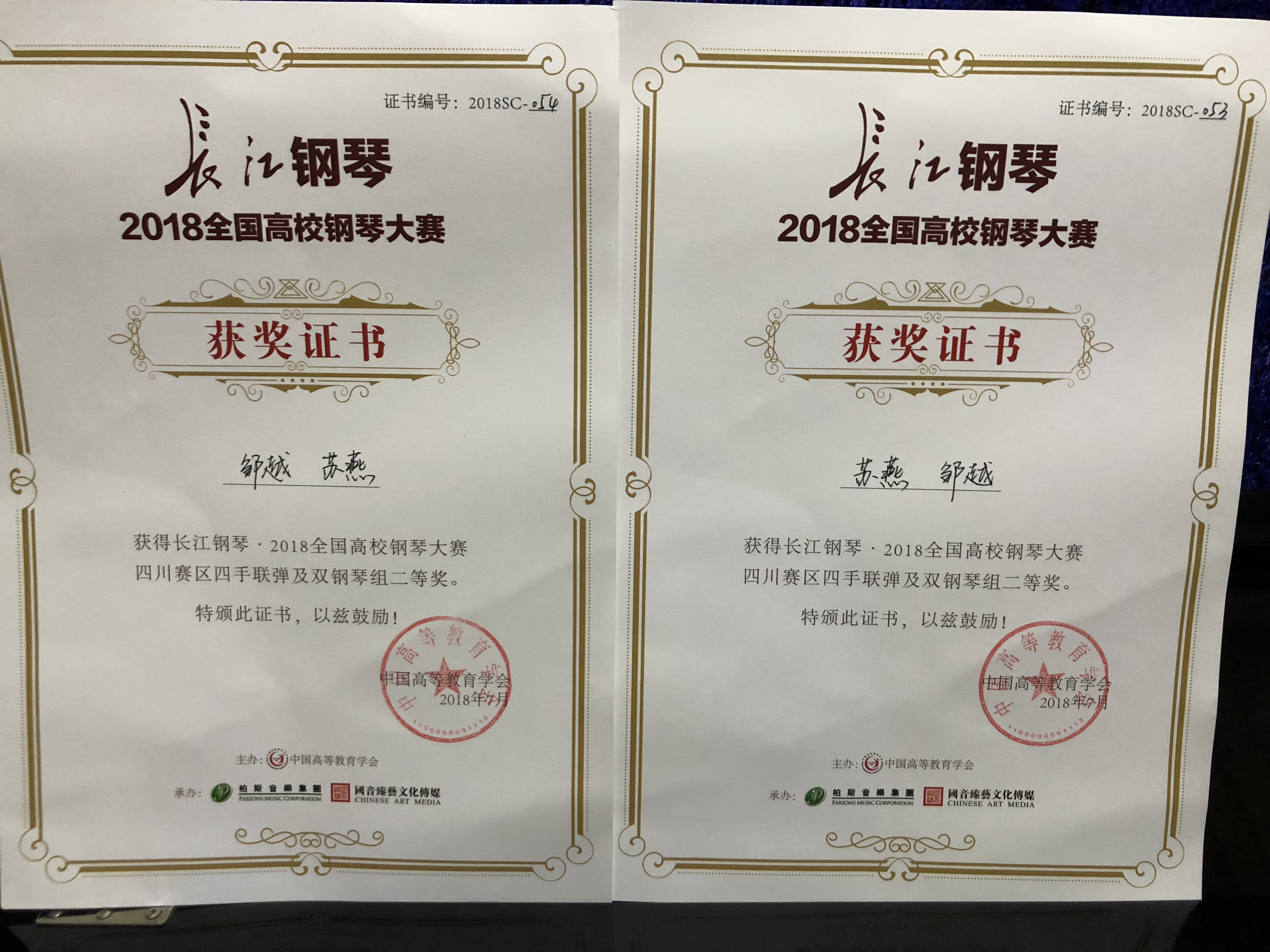 近期,中国音乐“小金钟”奖——长江钢琴第五届全国钢琴比赛预选赛在全国各地纷纷落下帷幕。声乐歌剧系青年艺术指导教师邹越和苏燕在此次比赛中荣获四川赛区四手联弹及双钢琴组二等奖。