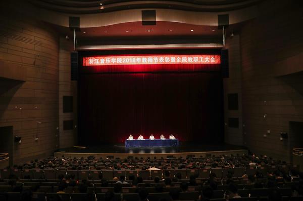 9月5日下午,在全国第34个教师节即将来临之际,学院在大剧院隆重召开2018年教师节表彰暨全院教职工大会。学院党政领导张建国、贾秀英、张鸿雁、方培新、杨九华,各系(部)、单位、部门全体在岗教职工,附属音乐学校全体教职员工,乐典公司各部门负责人等参加。大会由学院党委副书记贾秀英主持。