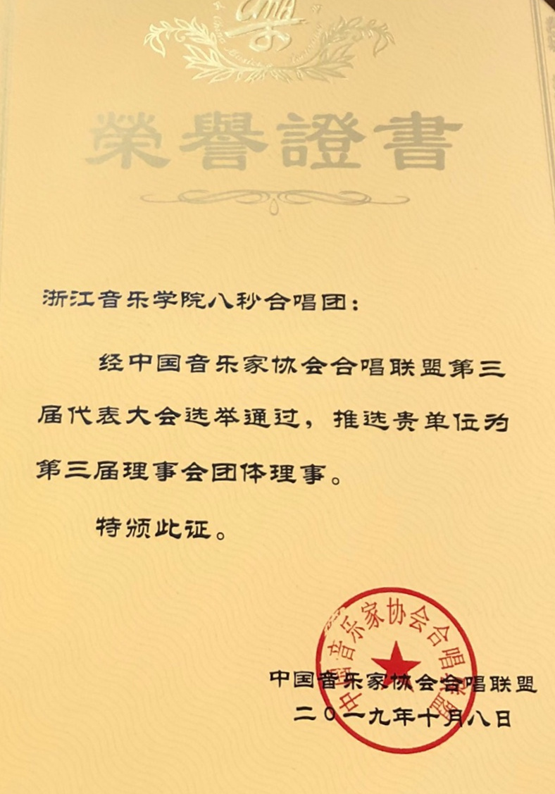 大会修改了《中国音协合唱联盟章程》,选举产生了81名个人理事和75个团体理事。中国音协副主席、著名作曲家孟卫东当选主席。我院“八秒”合唱团艺术总监、国家一级指挥阎宝林教授当选为中国音乐家协会合唱联盟第三届副主席,我院“八秒”合唱团推选为中国音乐家协会合唱联盟第三届理事会团体理事。
