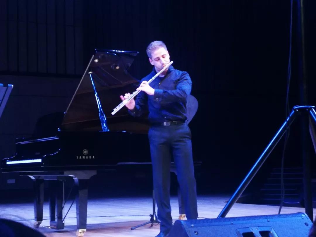 小号音乐会结束后,一场长笛独奏与重奏音乐会又开始了。这场音乐会的主角是优秀的青年长笛演奏家,卡塔尔交响乐团首席长笛亚历山大·赫斯金。赫斯金出生于白俄罗斯,是莫斯科柴科夫斯基音乐学院的高材生,曾任莫斯科大剧院交响乐团短笛首席。这个年轻演奏家属于“才高八斗”式的人物,技术超好,音乐全面,还有着鲜活别致的演奏风格。当晚他以斯蒂芬·利亚斯的《异想天开的长笛独奏》开场,这首乐曲展现了令人难以想象的现代长笛技巧(气声演奏,双音演奏等),使人们充分感受到了他驾驭长笛的神奇能力。