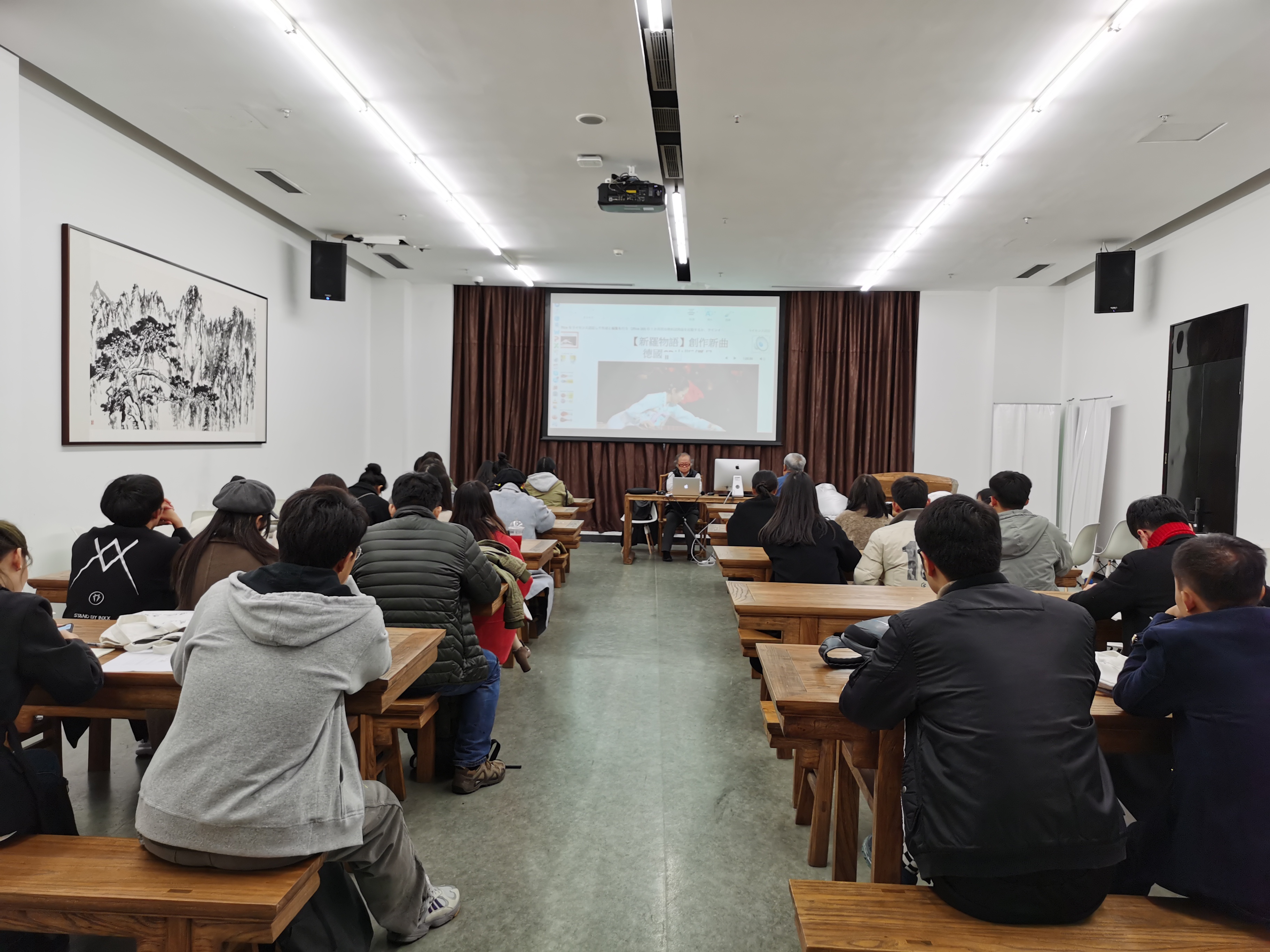 讲座中,刘宏军以日本宫廷雅乐作为切入点,讲解了由唐代丝绸之路为纽带而发展繁盛的亚洲音乐文化。讲座内容主要侧重于日本,同时涉及朝鲜半岛、西亚与东南亚,并从乐器形制和演奏方式等方面进行比较,清晰直观地向大家展示了文化融合的成果。结尾的互动提问环节,同学们积极发言提问,表现出对于“隋唐古谱乐舞”的极大兴趣。讲座在热烈的掌声中顺利结束,师生现场合影留念。