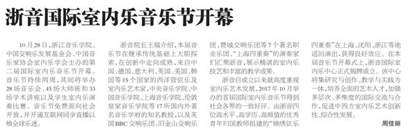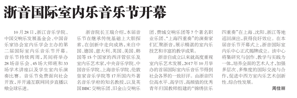 10月28日,浙江音乐学院、中国交响乐发展基金会、中国音乐家协会室内乐学会主办的第二届国际室内乐音乐节开幕。音乐节持续两周,其间将举办28 场音乐会、45 场大师班和 33场学术讲座以及学生室内乐演奏比赛。音乐节免费面向社会开放,并开通互联网同步直播以飨全球乐迷。浙音院长王瑞介绍,本届音乐节在继承传统基础上大胆探索,在创新中走向成熟,来自中国、德国、意大利、英国、美国、韩国等 15 个国家的西洋管弦乐及室内乐艺术家,中央音乐学院、中国音乐学院、上海音乐学院、伦敦皇家音乐学院等 17 所国内外著名音乐学府的知名教授,以及英国BBC交响乐团、旧金山交响乐团、费城交响乐团等 7 个著名职业乐团、 “上海四重奏”的演奏家们汇聚浙音,展示精湛的室内乐技艺和丰富的教学成果。浙音自成立以来就高度重视室内乐艺术发展,2017年10月举办的首届国际室内乐音乐节得到社会各界的一致好评。由浙音四位高水平、高学历、高颜值的优秀青年归国教师组建的“锦绣弦乐四重奏”在上海、沈阳、浙江等地巡回演出,获得良好效应。在本届音乐节开幕式上,浙音国际室内乐中心正式揭牌成立。该中心将集研究与创作、教学与实践为一体,培养全面的艺术人才,加强多层次、多维度的国际交流与合作,促进中西方室内乐艺术创新性、综合性发展。