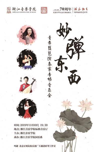 本周日,本届国乐艺术节琵琶专场——“妙弹东西”青年琵琶演奏家音乐会将在浙音举行,演出汇聚了国内音乐学院多位青年琵琶演奏家,其中有中央音乐学院民乐系赵洁、武汉音乐学院中国器乐系黎芸、浙江音乐学院国乐系李跞、浙江音乐学院国乐系杨婧等,他们是近年来活跃国内外各大舞台的青年才俊。