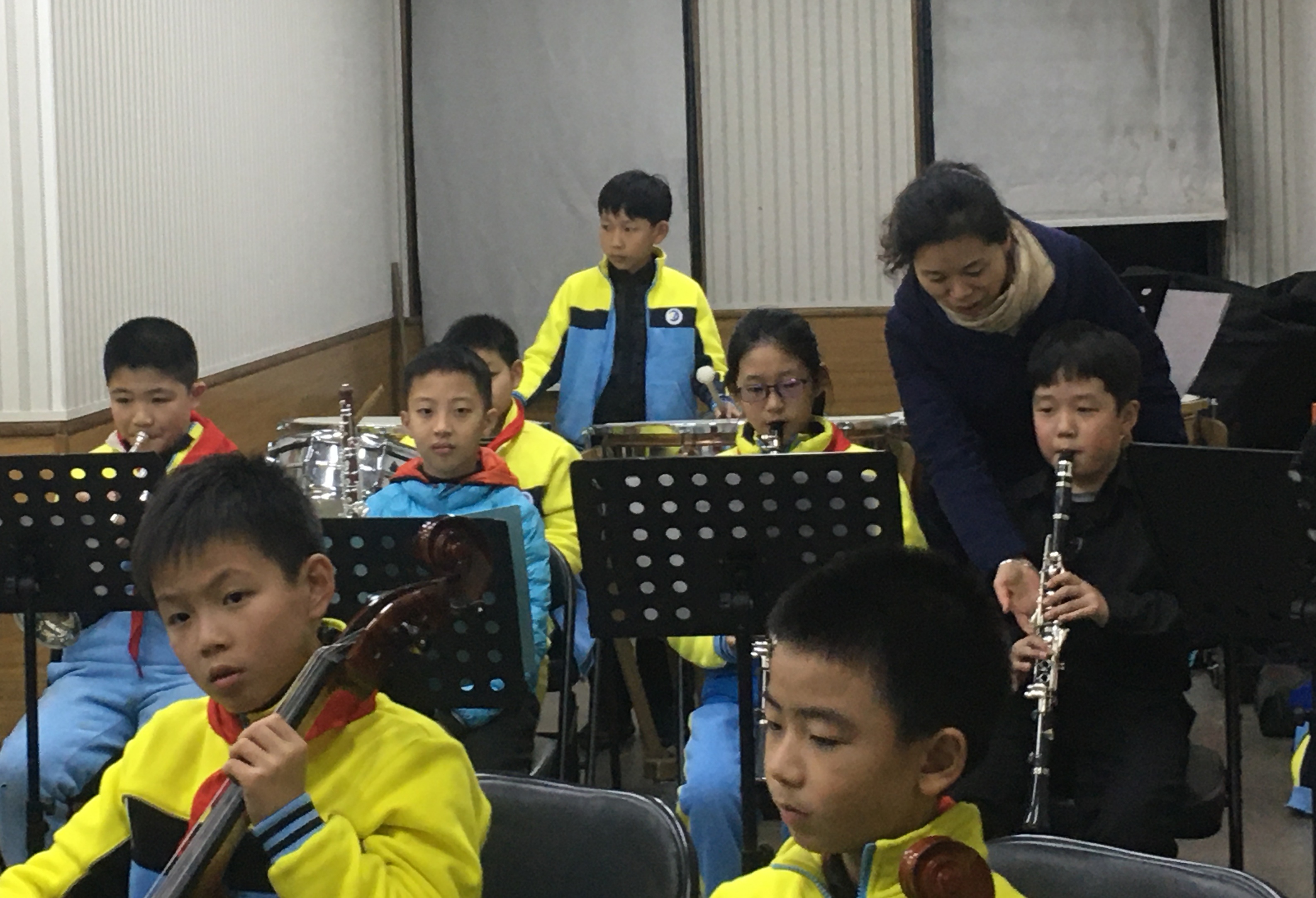 在胜利小学,党员教师们对乐团小团员们开展了认真的演奏指导。他们有的为小团员调整琴弦、校对音准,有的为小团员安装哨片、维修乐器,并分声部开展了现场教学,并耐心地为小团员们演奏示范。在乐团合排之前,教师们又指导小团员们分弦乐、管乐打击乐两大声部合奏训练,最后当指挥合排时,小团员们演奏的肖斯塔科维奇的《Jazz Suite No.2》在音准与声部平衡方面均获得了较大改观。