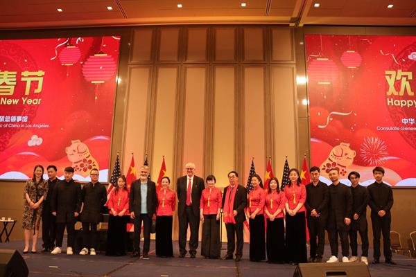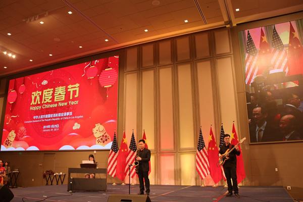 洛杉矶当地时间1月29日,浙江音乐学院艺术团受邀参加驻洛杉矶总领馆2019新春招待会演出。中国驻洛杉矶总领馆总领事张平及其夫人、美国国会众议员、加州众议员和参议员、洛杉矶县县政委员、圣盖博市议员、蒙特利公园市市长和议员、约巴林达市议员等地方民选官员以及南加州近600多位中美各界人士观看了演出。