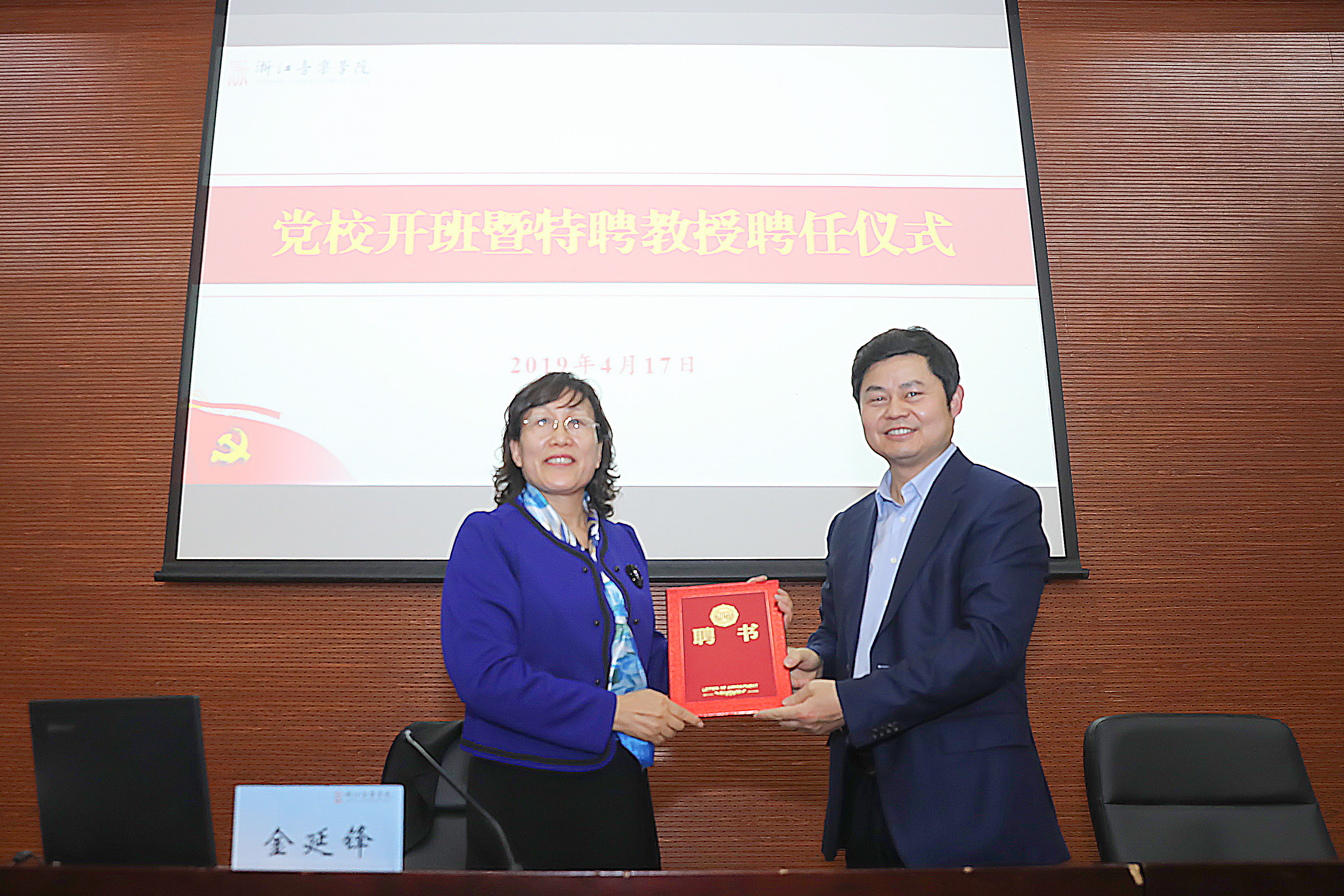 4月17日下午,我院党校特聘教授聘任暨开班仪式在学术报告厅举行。浙江省委党史研究室原主任、浙江省中共党史学会会长、研究员金延锋受聘为我院党校特聘教授。学院党委副书记、副院长张建国出席并向金延锋颁发聘书。
