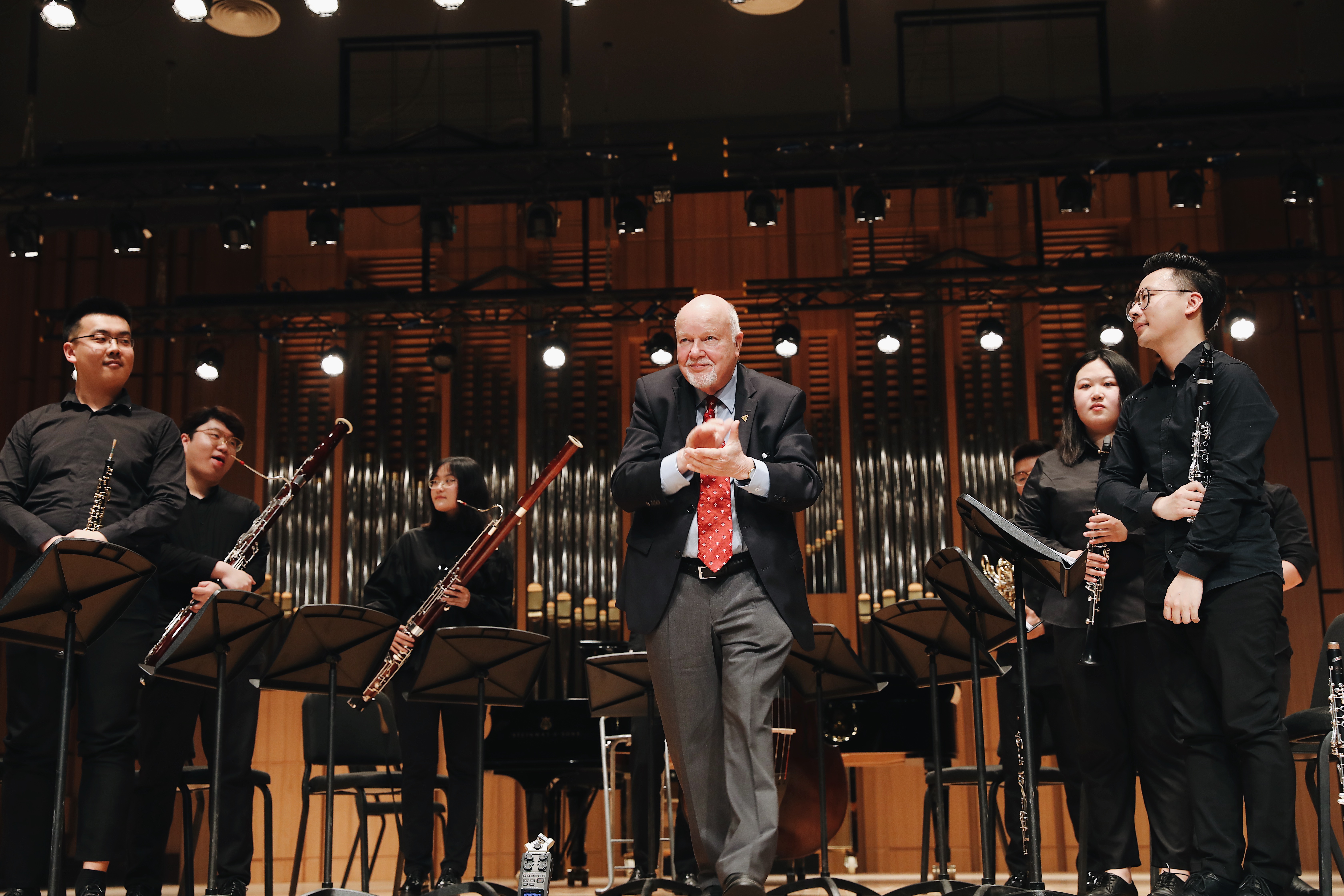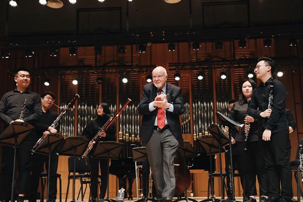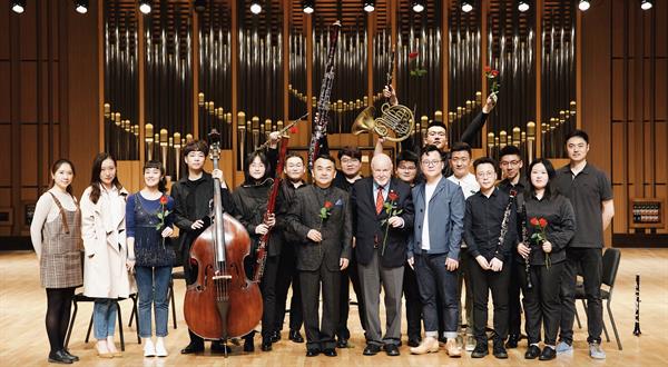 4月22日,学院标准音乐厅奏响了由德国著名圆号演奏家、教育家Peter Steidle先生排练指导的管乐室内乐音乐会,音乐会由管弦系8名优秀学生演奏,管弦系主任董德君教授担任讲述人。