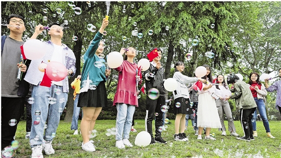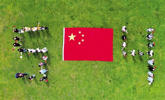 快闪活动现场,青年们拼出“5·4”字样,纪念“五四运动”100周年。