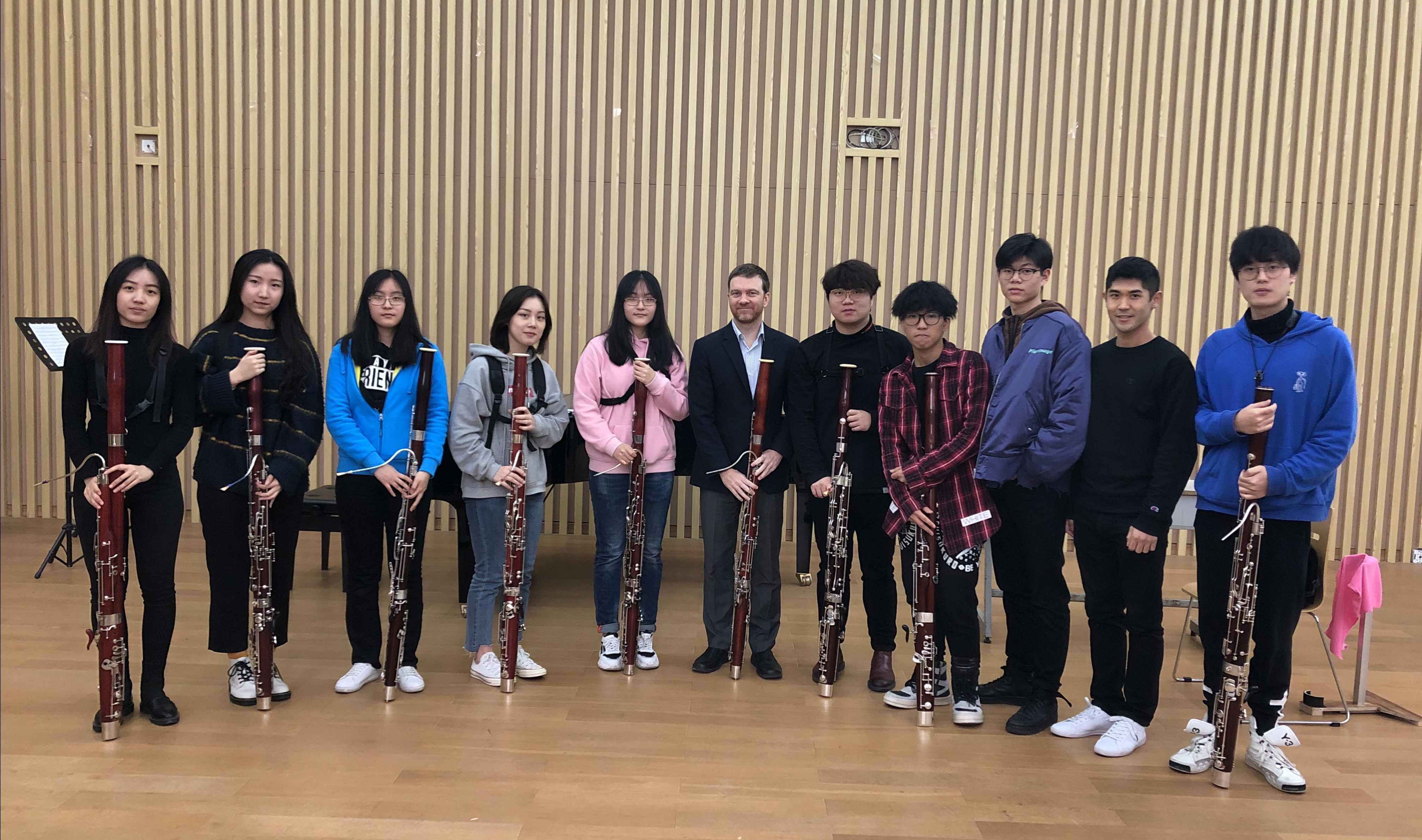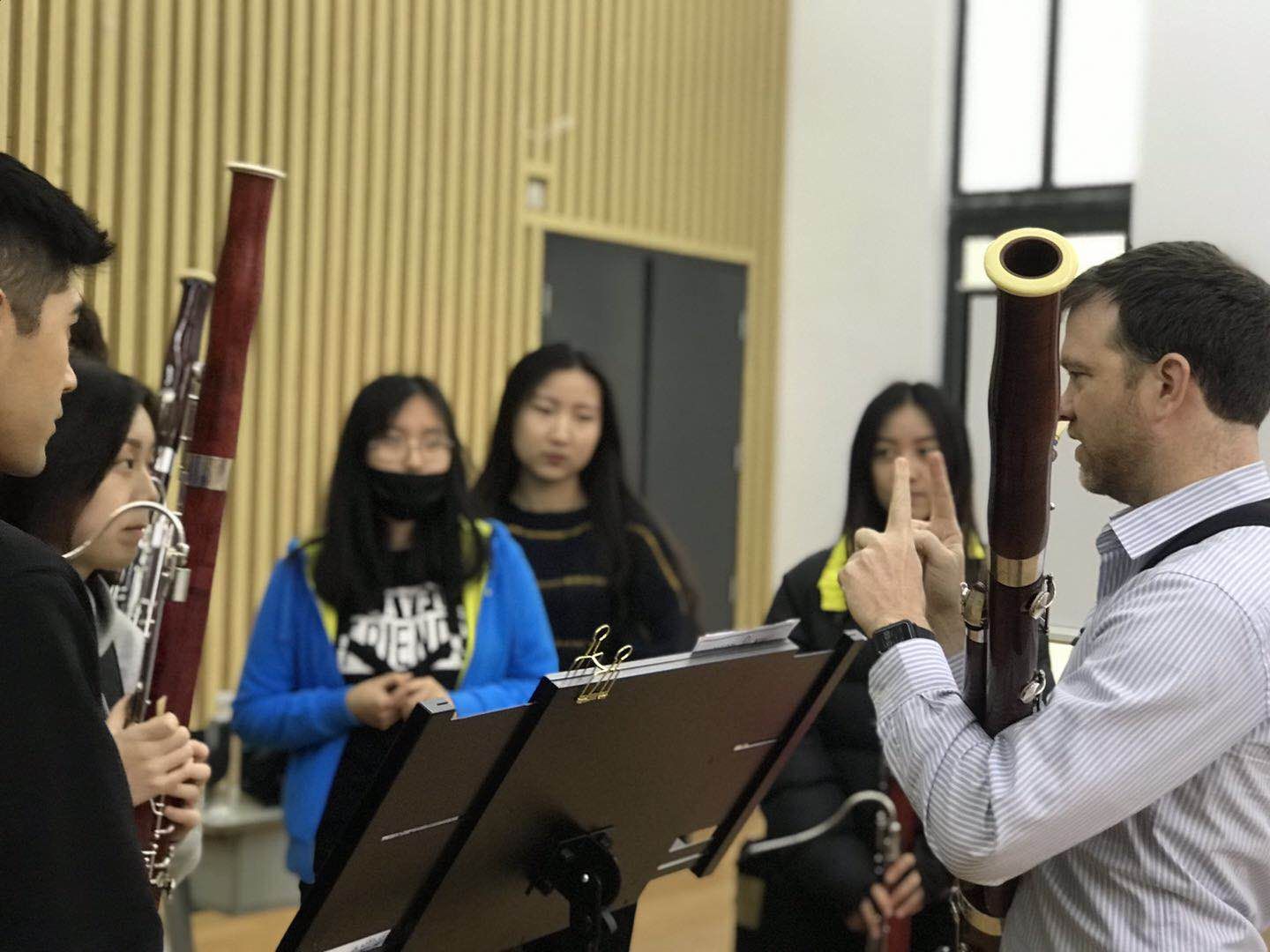在CHRISTOPHER SCHAUB巴松大师班,CHRISTOPHER SCHAUB教授着重讲述了巴松经典乐曲中的强弱规律、精准的节奏把握以及颤音演奏技巧。同时,他还对学生们演奏的巴松八重奏《Idyl and Hunter's Soy in the Woods》给予指导和建议,鼓励学生们将这一较为冷门的重奏形式一直坚持下去。
