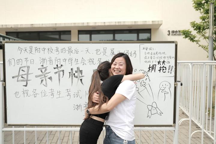 原来这是浙江音乐学院附属音乐学校2019年招生考试的最后一天,这些来自祖国各地为了音乐梦想聚集在浙音附中的艺术生们,已经连续参加了三天的考试。经过激烈角逐,走到最后一天。恰逢母亲节的当天,在考生走出考场的地方,浙音附中学生会的师兄师姐贴心的竖起了一块小白板,上面大大地写着,“母亲节快乐”,温馨提示:当你走出考场时,请不要忘记给你可爱的妈妈一个大大的拥抱。