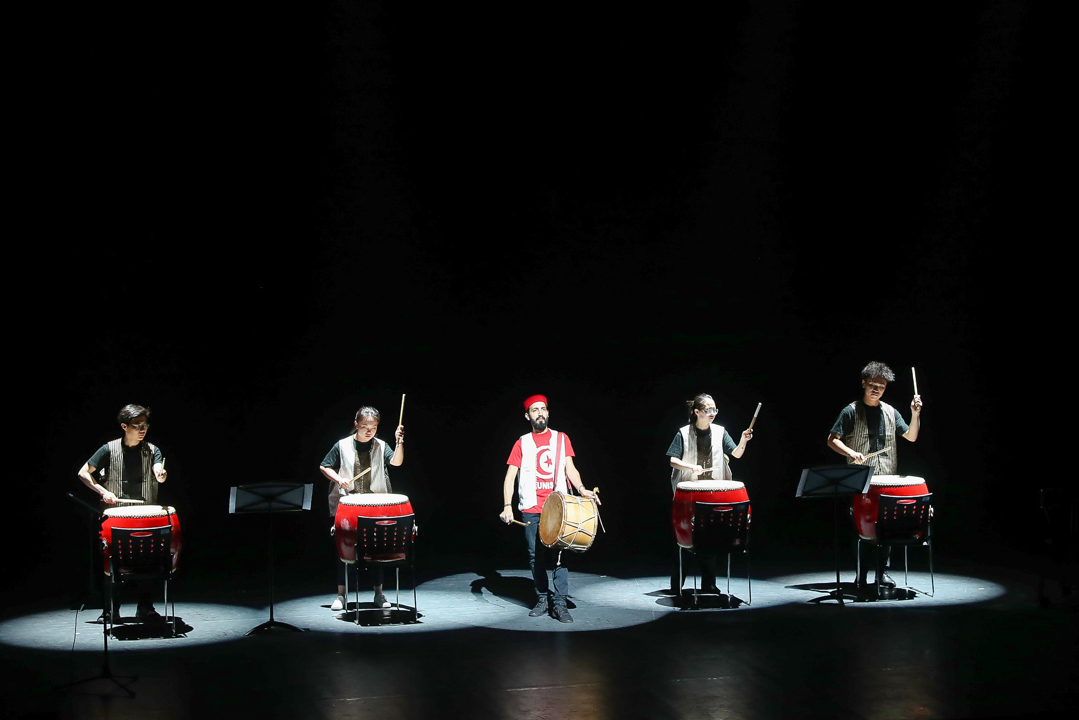 演出在极富节奏感的打击乐合奏《SADAWI》中拉开序幕,突尼斯鼓手那瑟丁•切布里携传统突尼斯鼓,与我院打击乐学生的中国大鼓合作了一曲中阿融合的动感乐章,瞬间点燃全场气氛。随后,国乐系学生演奏了充满异域风情的《沙漠玫瑰》与《丝路》,并分别与来自埃及的瓦利德·艾哈迈德合作演出卡龙与扬琴合奏《It Makes Me Feel Difficult》、与来自阿尔及利亚的萨利姆·达达合作演奏《Love Song》。这首《Love Song》由萨利姆·达达先生本人作曲,中国传统乐器演绎,其中达达先生还穿插了一段阿尔及利亚传统弹拨乐器Kwitra独奏。舞蹈艺术家们为我院舞蹈系学生创编了多个饱含阿拉伯风情的舞蹈佳作,充分展示了西亚北非地区不同国家的民族文化特色。群舞《Ilaw Tounsi》节奏明快、情绪热烈,将演出气氛推向高潮。现场宛如一场欢乐的派对,所有师生伴随音乐即兴舞动,为本次演出划上了一个圆满的句号。